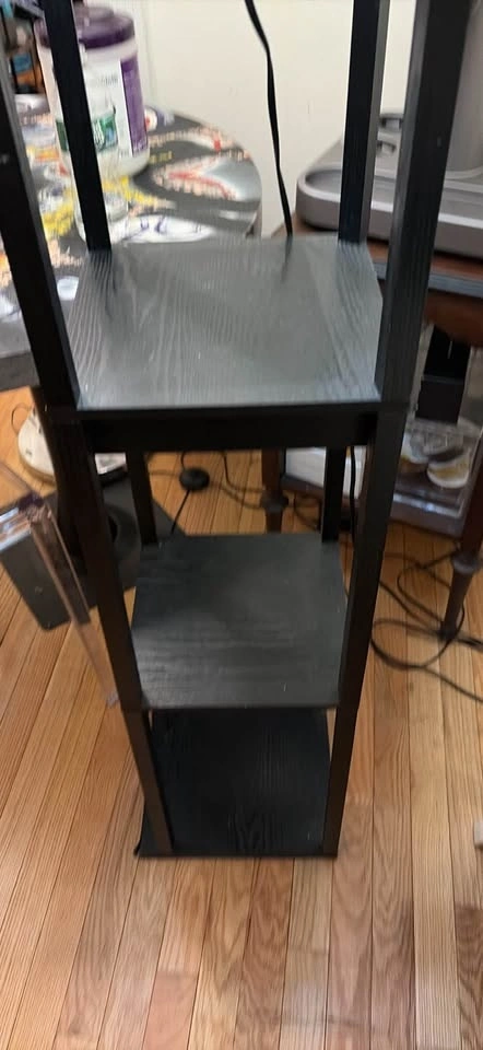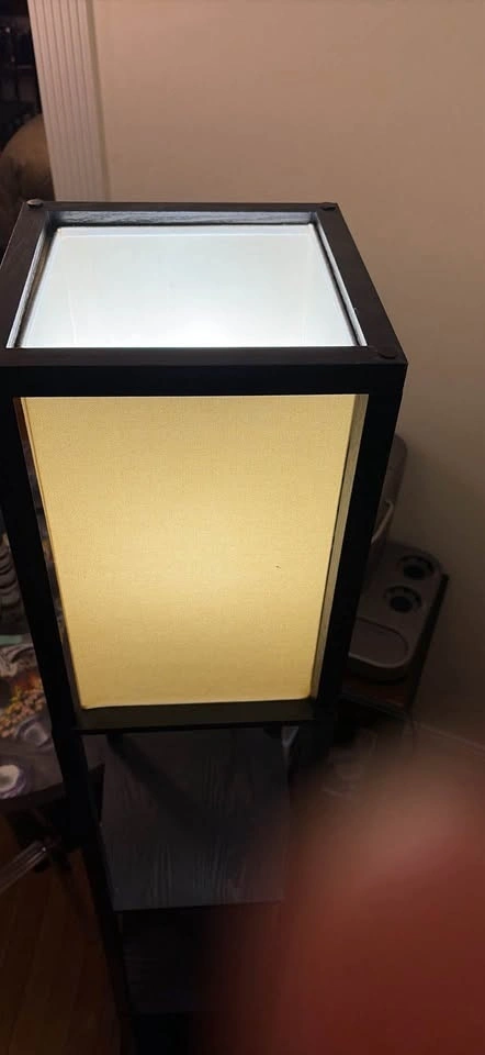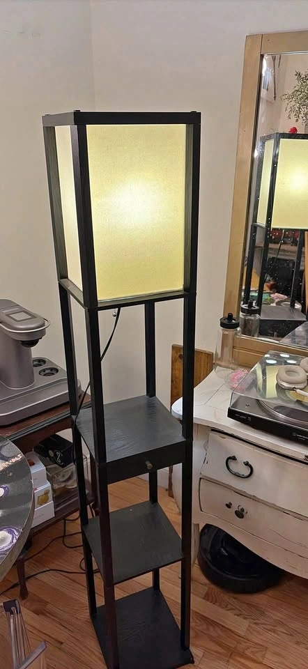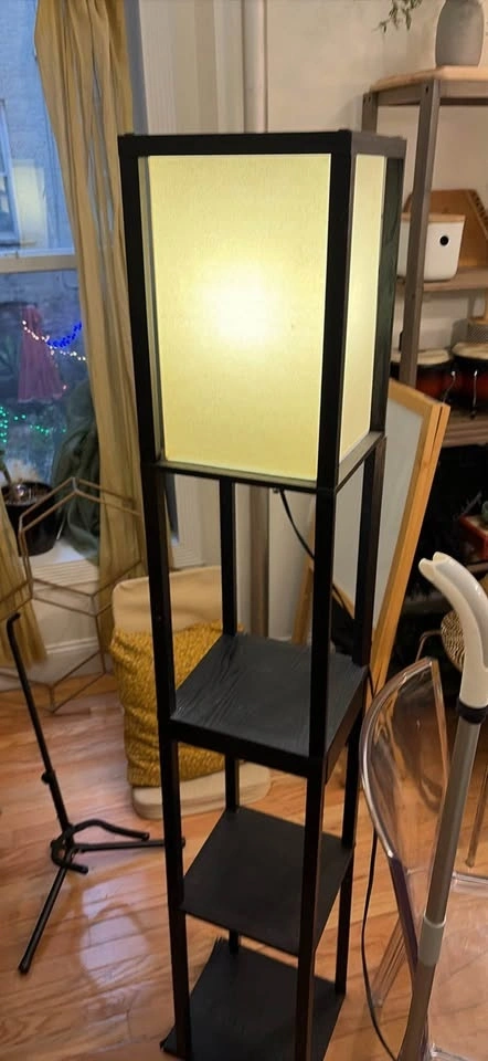 Functional black floor lamp with three shelves for storage. One shelf has a small pull-out drawer. The fabric shade gives off a nice warm light. Easy pickup in Hell's Kitchen, it's not too heavy.