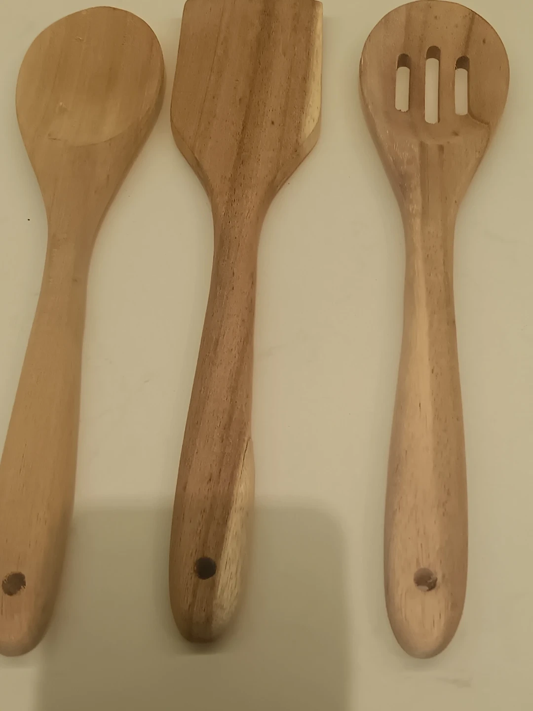 Selling a set of three wooden kitchen utensils! Includes a wooden spoon, a spatula, and a slotted spoon.