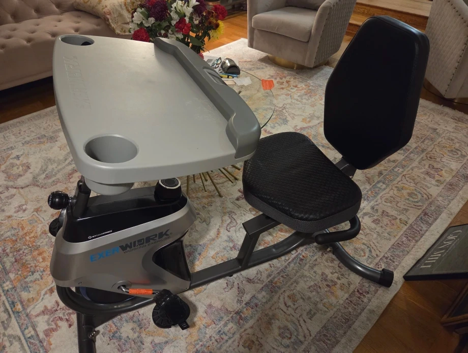 Get your work and workout done at the same time with this ExerWork recumbent exercise bike! It features a desk, so you can easily use your laptop or read a book while you cycle. Perfect for a home office or anyone looking to add some activity to their day.