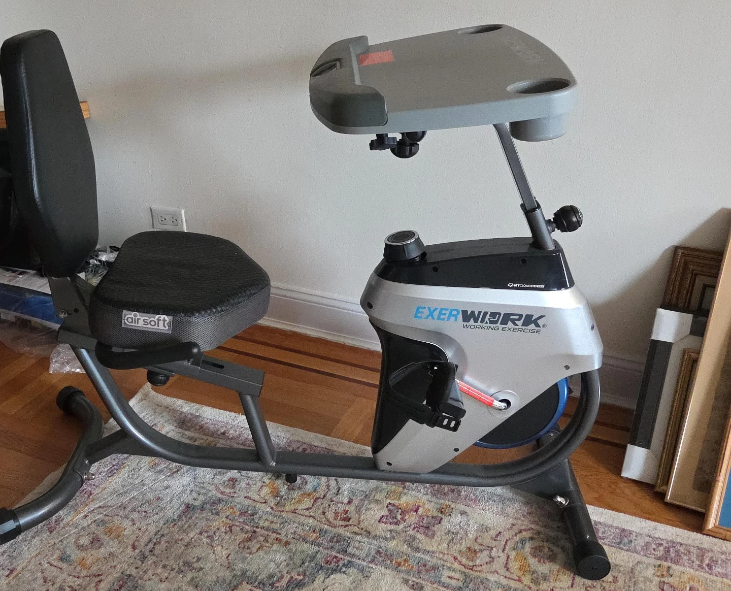 60Get your workout in while you work! This Exerwork recumbent exercise bike features a built-in desk, making it easy to stay active while you're on the computer or reading. The seat has airsoft padding for extra comfort during your workout. Additionally, the removable desk allows you computer access or book stand...work or watch Netflix.