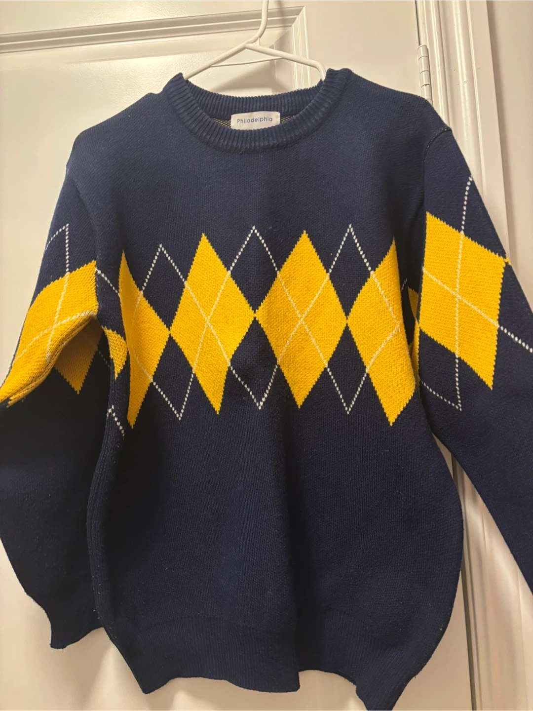 Cozy Philadelphia sweater featuring a classic argyle pattern in navy and yellow. Perfect for adding a touch of preppy style to your wardrobe. Great for layering during the cooler months!