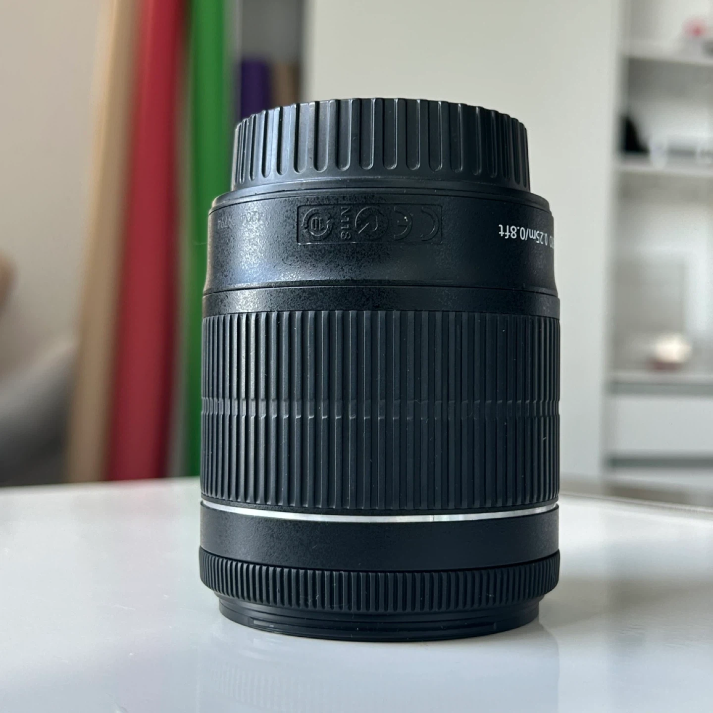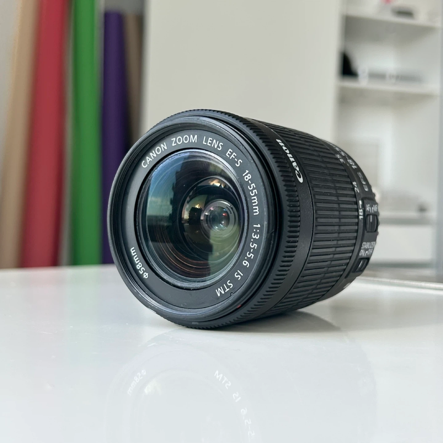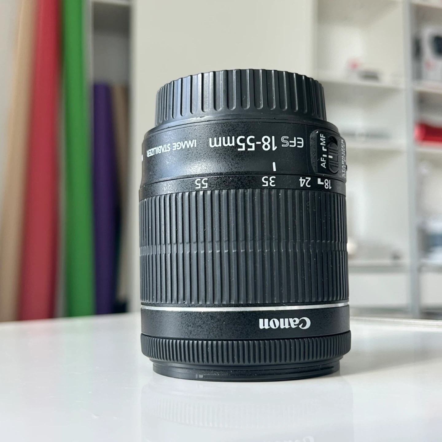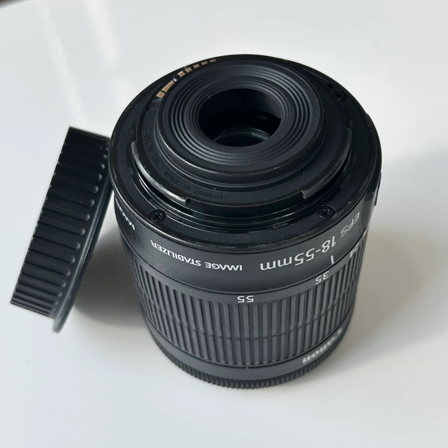 This Canon EF-S zoom lens offers a versatile focal range of 18-55mm. It features an f/3.5-5.6 maximum aperture and STM stepping motor for smooth autofocus. The lens includes image stabilization for sharper shots. Minimum focus distance is 0.25m/0.8ft.