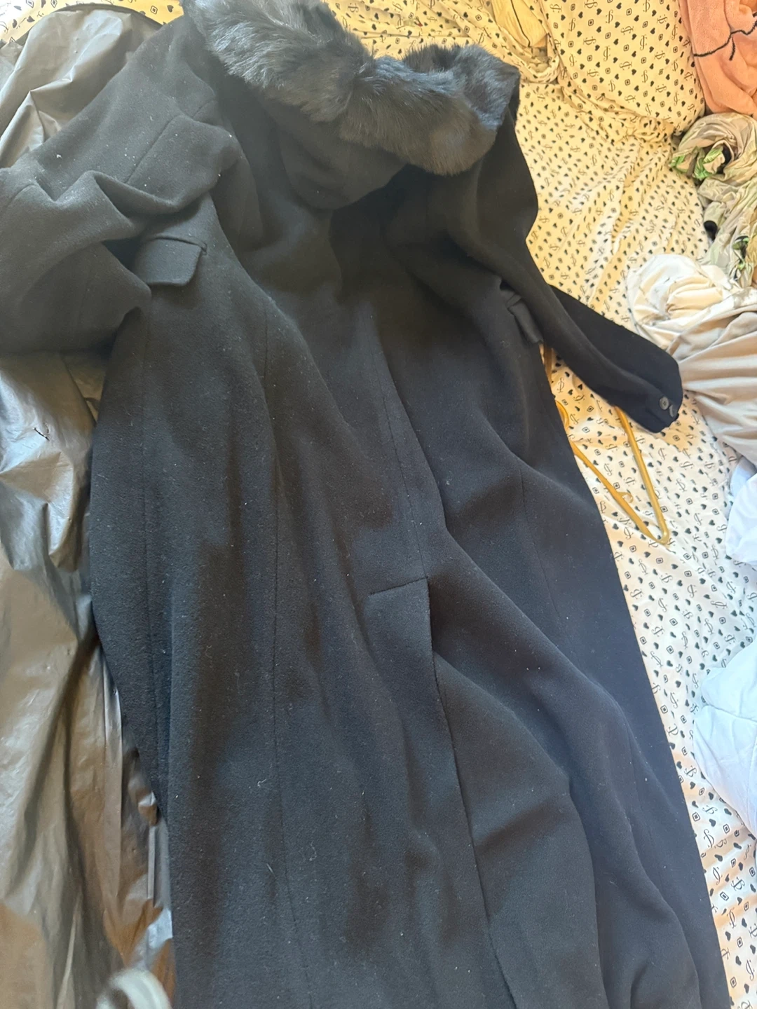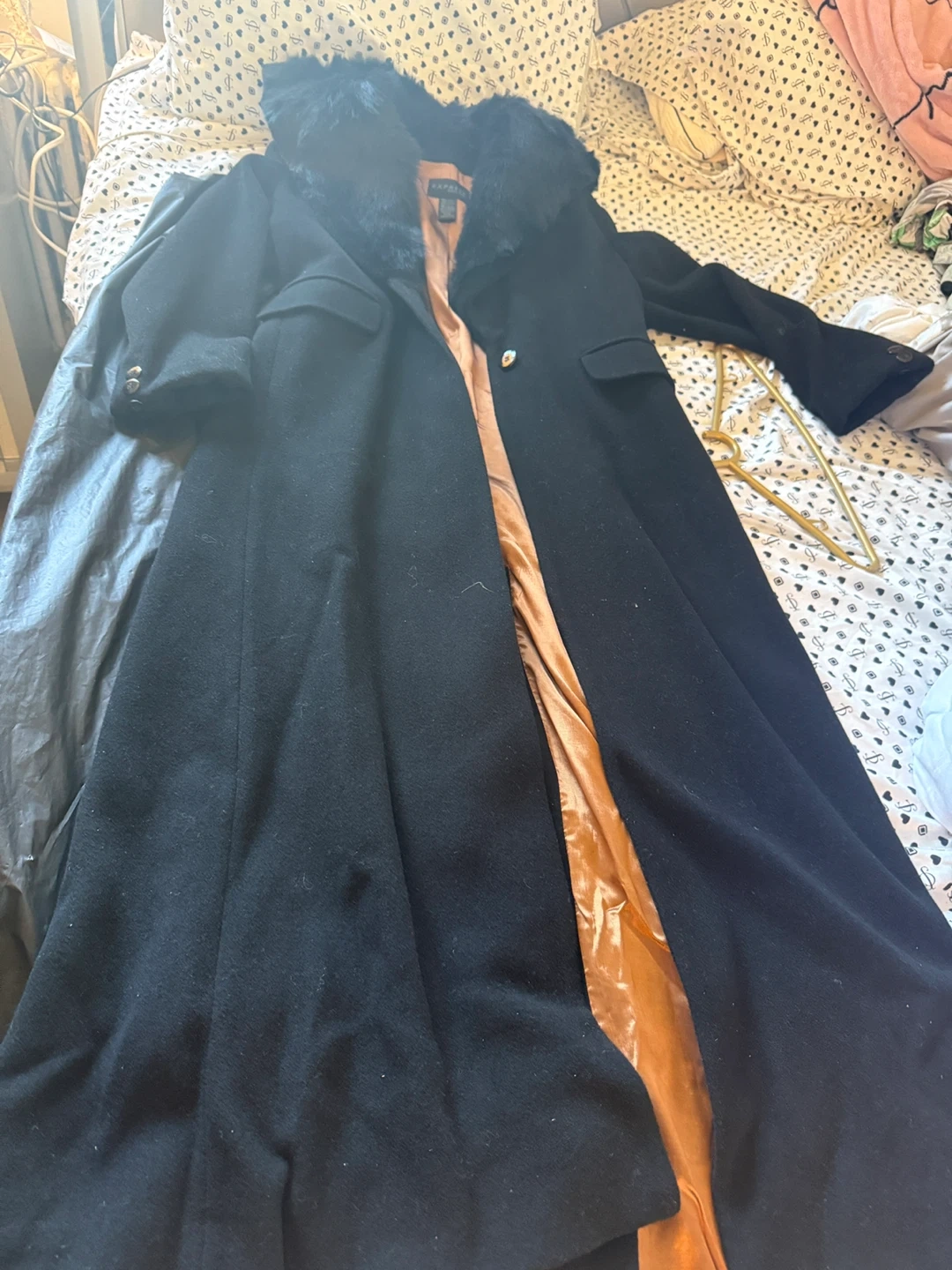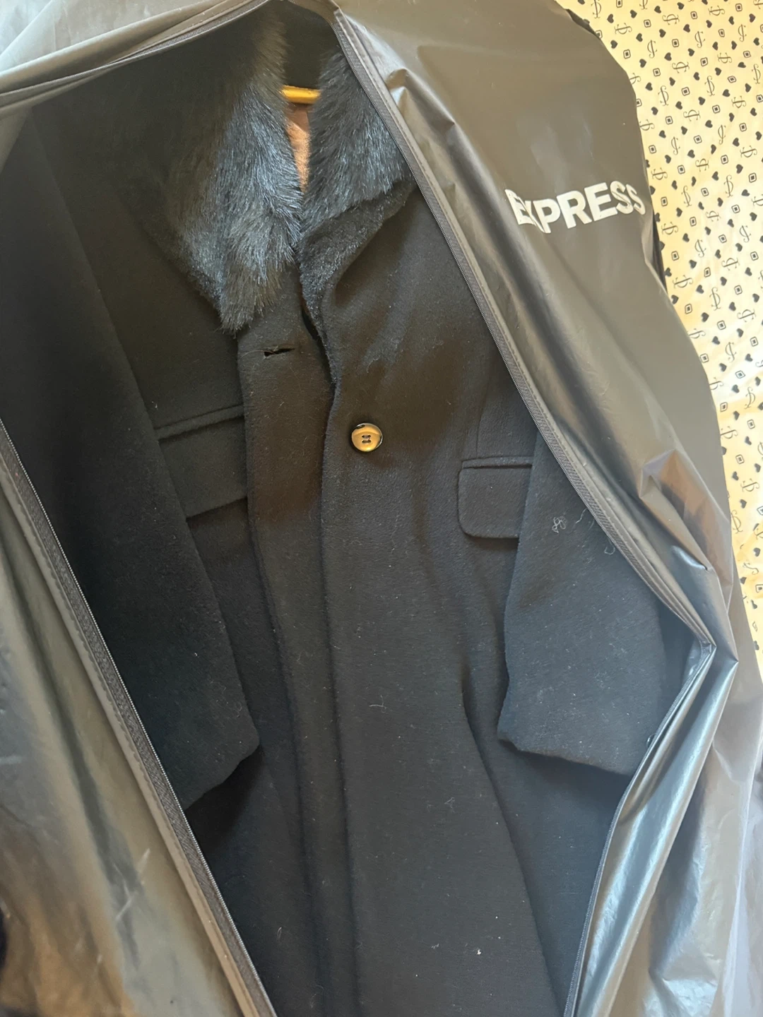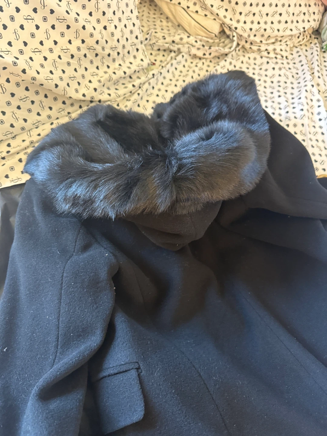 Selling a stylish black coat from Express! It features a beautiful faux fur collar that adds a touch of elegance. Perfect for keeping warm and looking chic during the colder months. Comes with a garment bag.