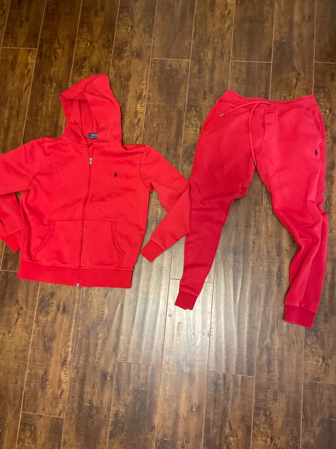Red velour tracksuit set by Polo Ralph Lauren. It's a zip-up hoodie and matching joggers. Made for comfortable wear.