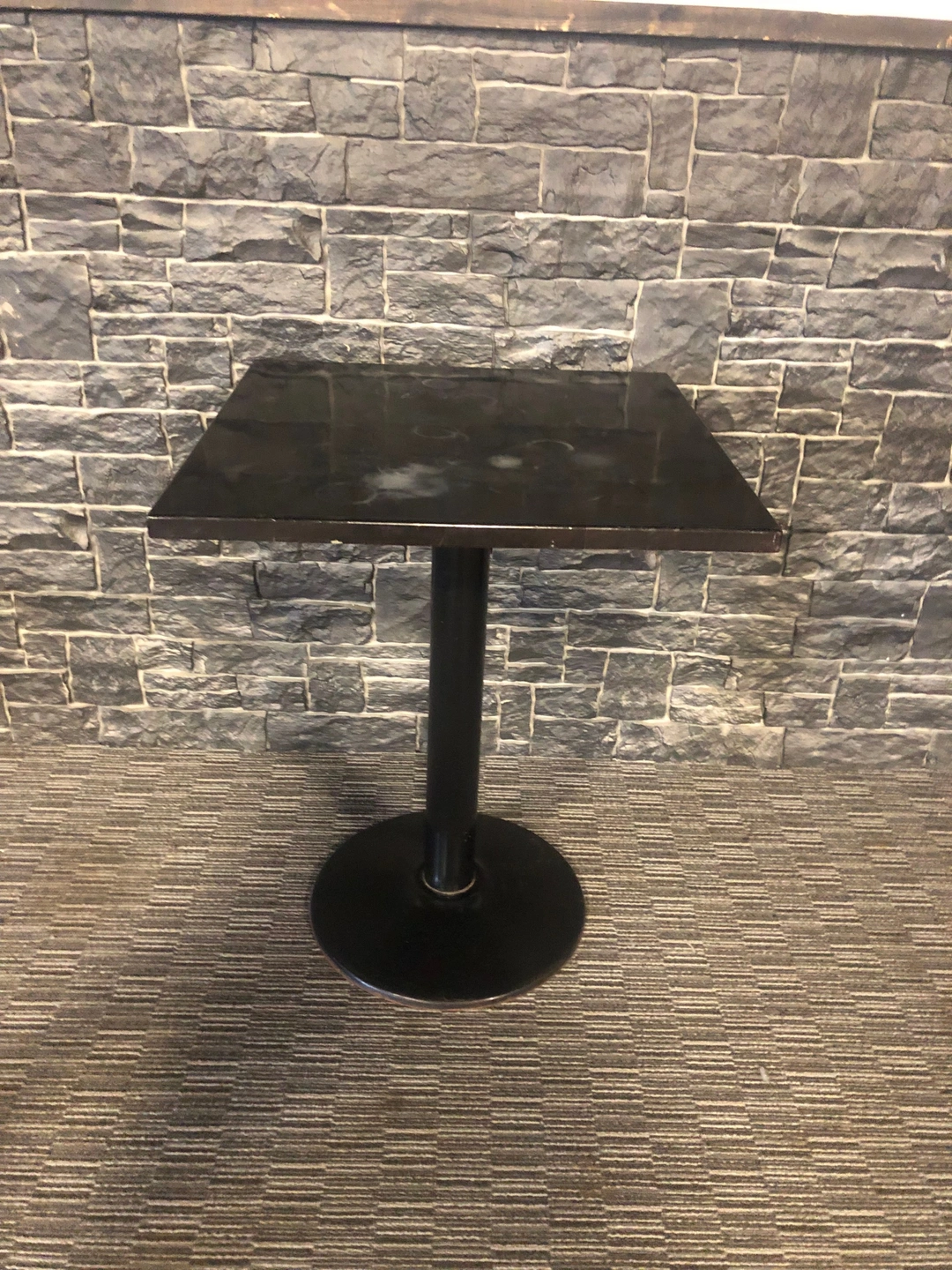 6 Black, Wood, Metal round base tables, with water ring marks. All different size tabletops, all with the same base.