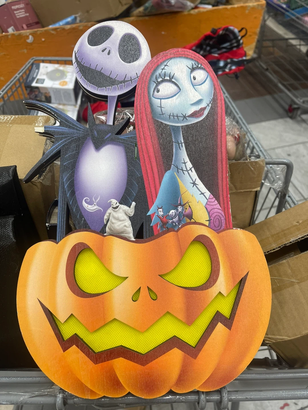 These are fun cardboard cutouts featuring characters from The Nightmare Before Christmas, including Jack Skellington, Sally, Oogie Boogie, and Lock, Shock, and Barrel, along with a Jack-o'-lantern. They're great for spooky Halloween decor!