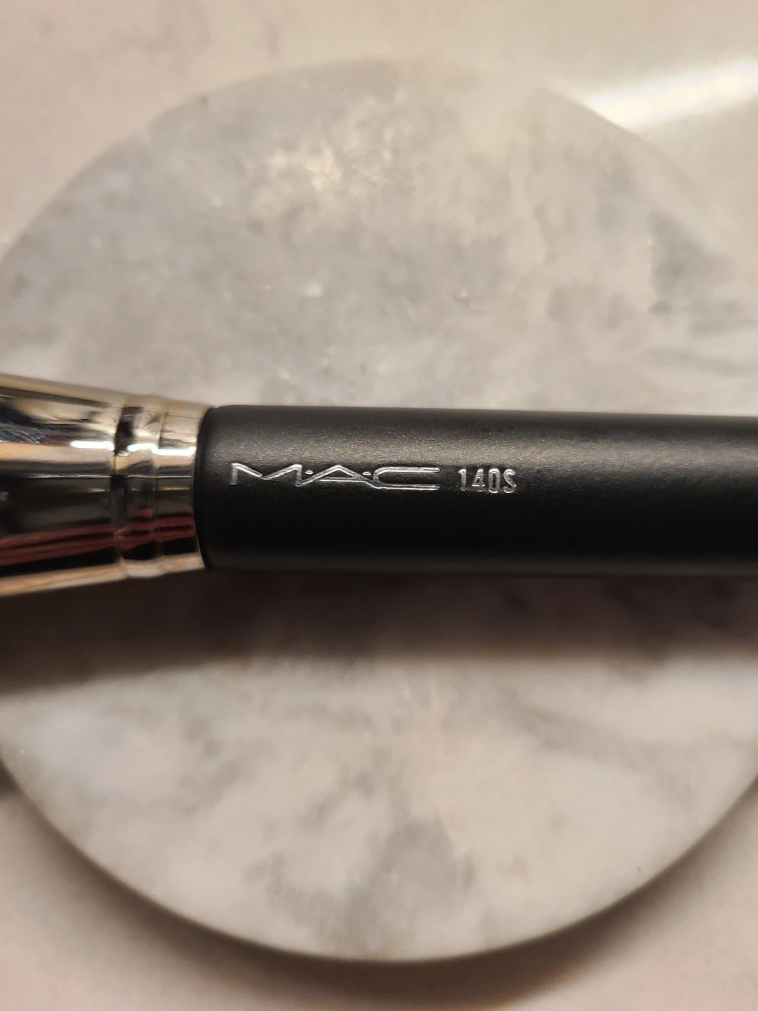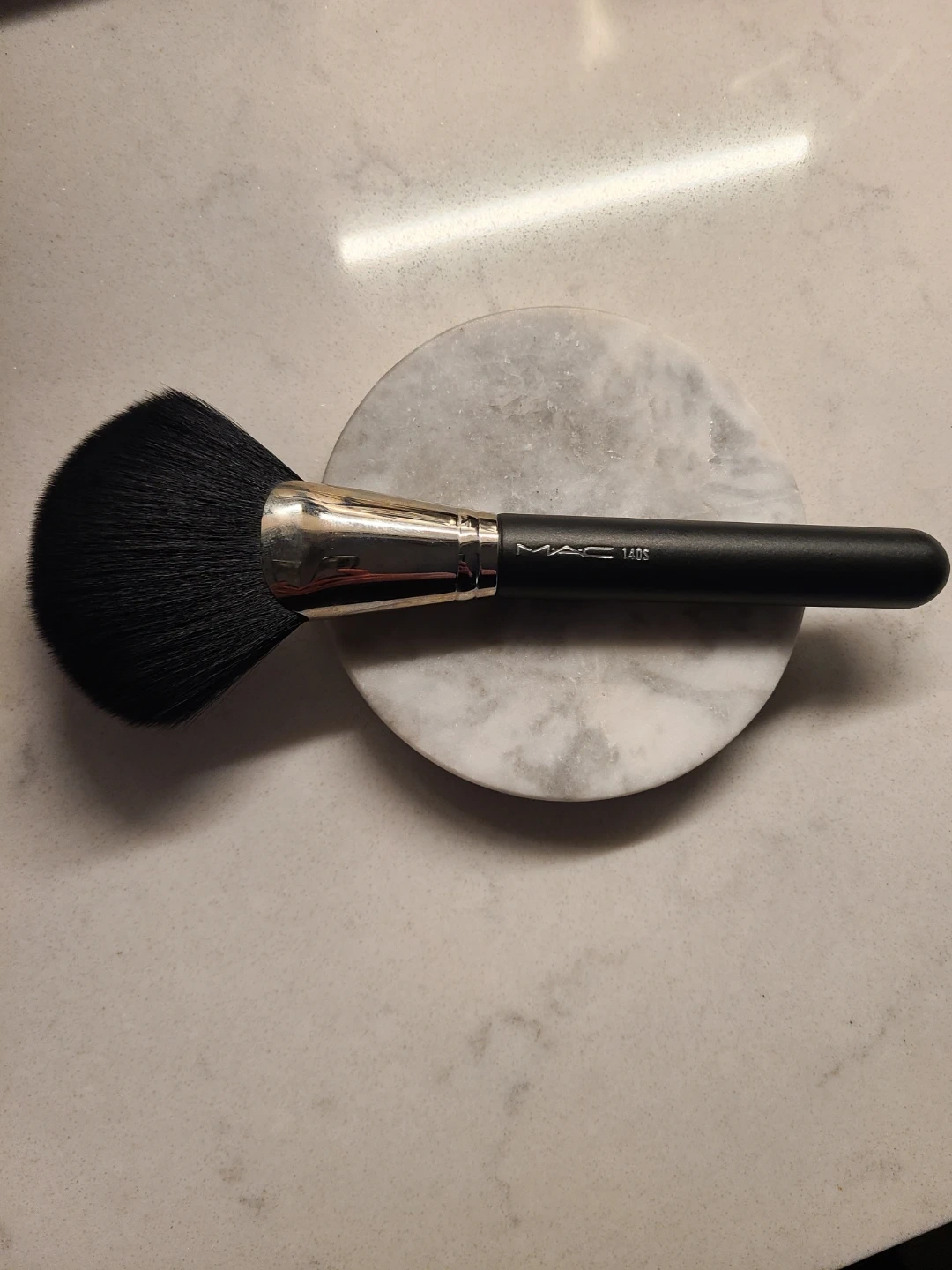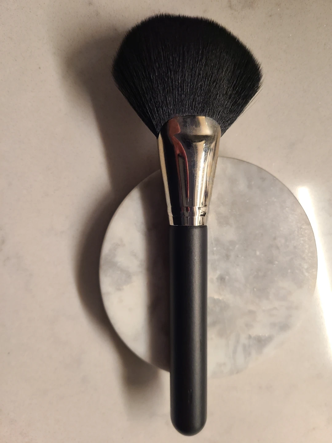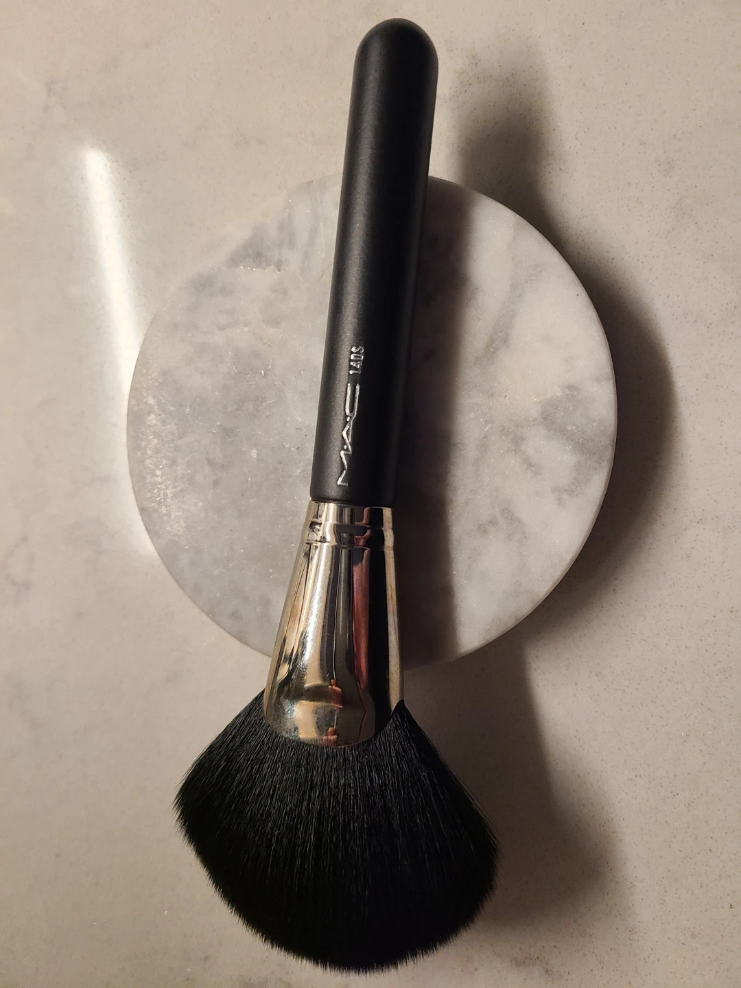 MAC 140S Fan Powder brush. It has a matte black handle and silver ferrule. The bristles are soft and black.
