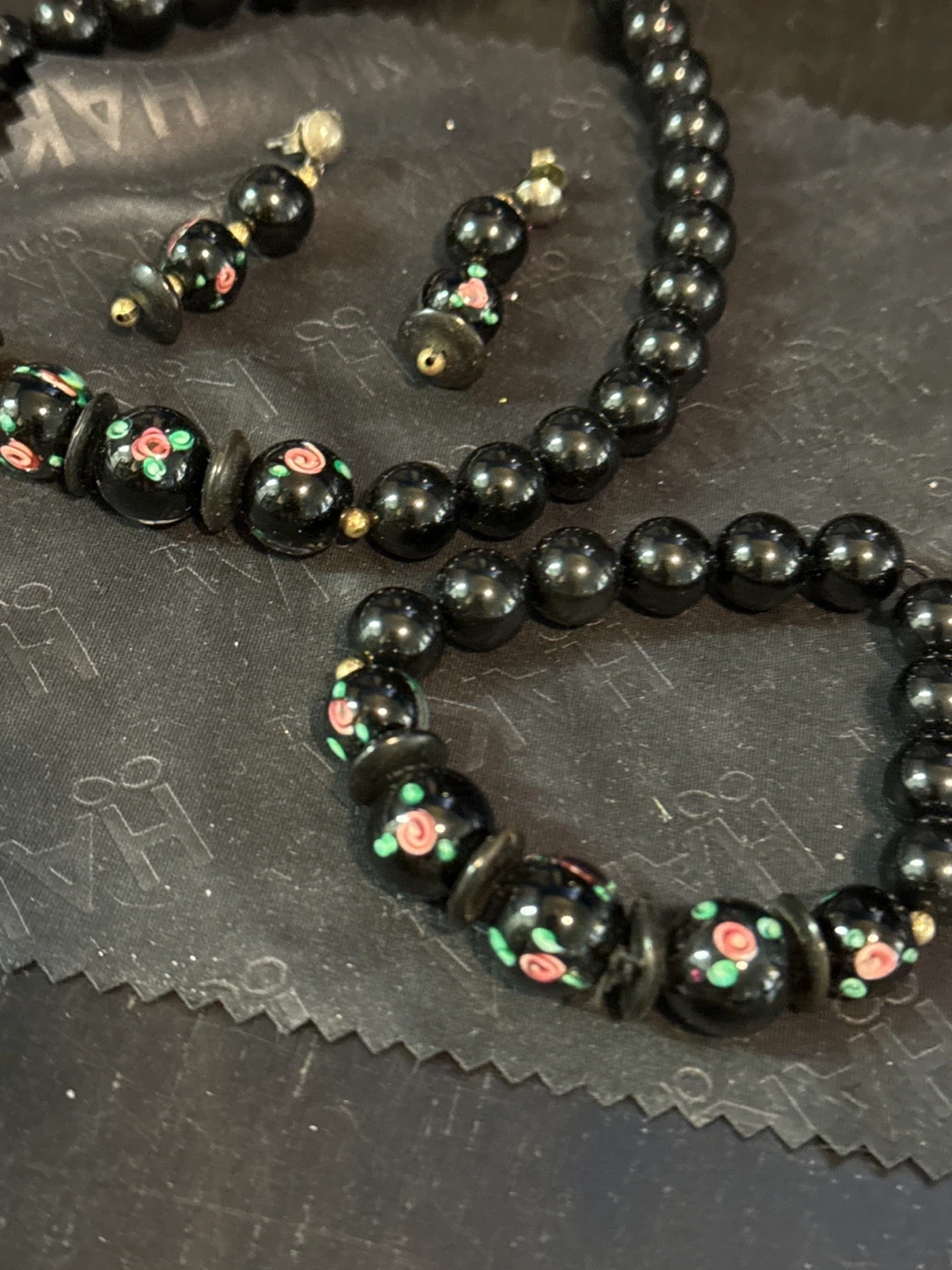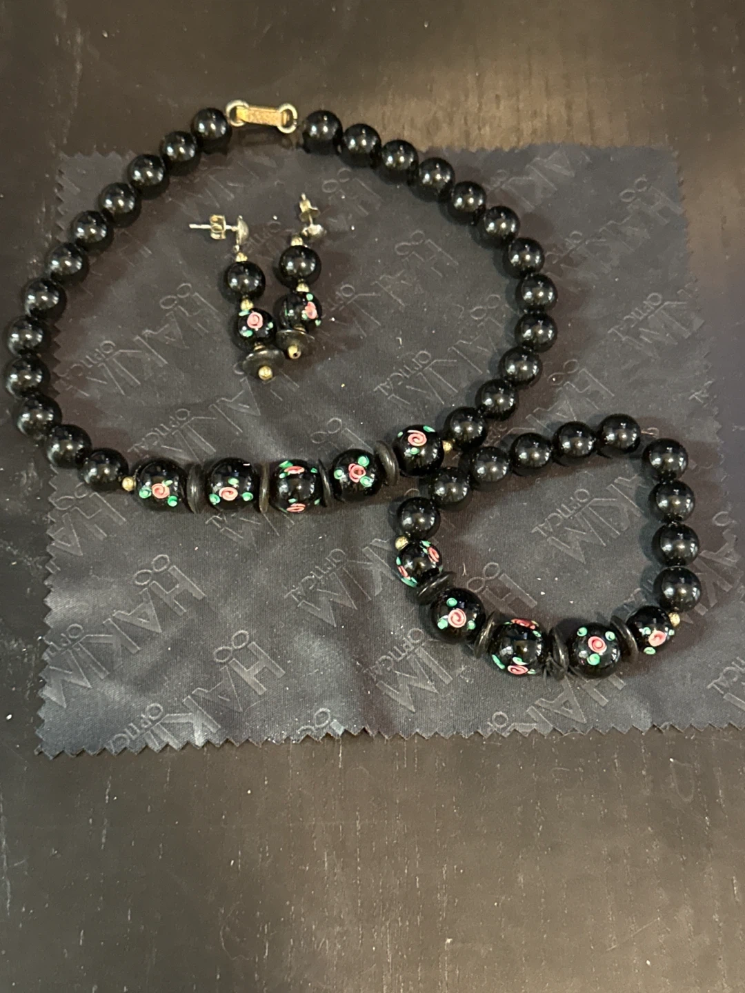 This is a three-piece jewellery set featuring black beaded components. It includes a necklace, a bracelet, and a pair of earrings. Each piece has a floral design with pink and green accents.