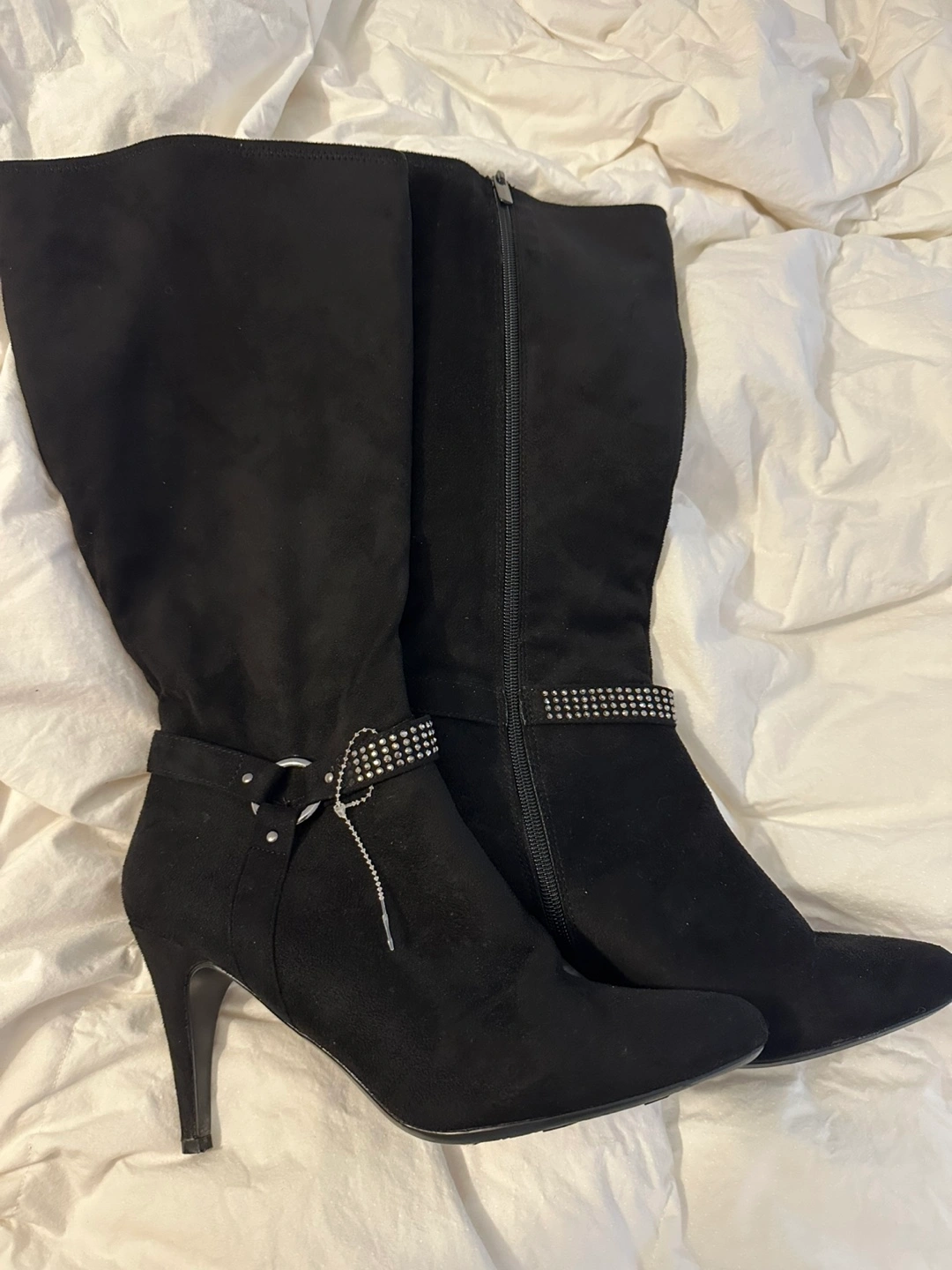 Selling a pair of boots in black suede ..They feature a stylish design with a stiletto heel and decorative embellishments. Size 8.5M