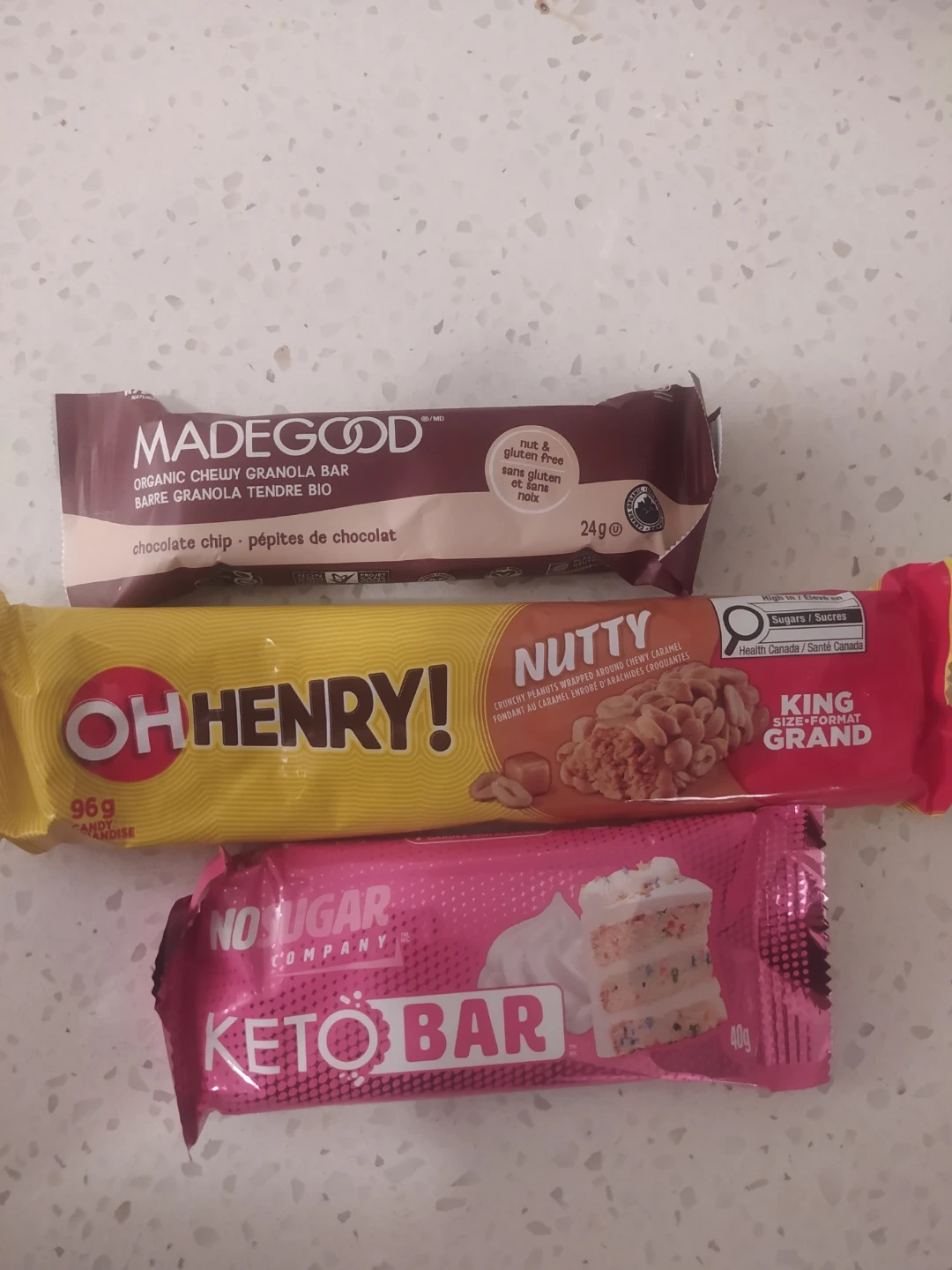 Three snack bars: MadeGood organic chewy granola bar, chocolate chip flavour. Oh Henry! Nutty King Size bar. No Sugar Company Keto Bar, 40g. They're nut and gluten free.