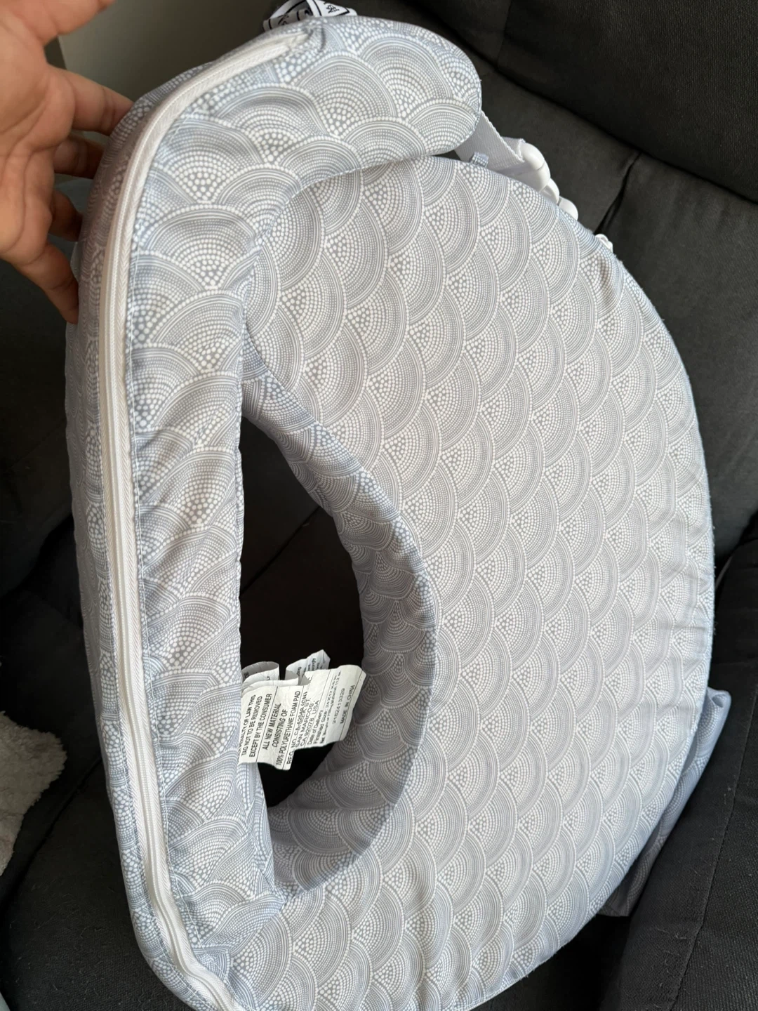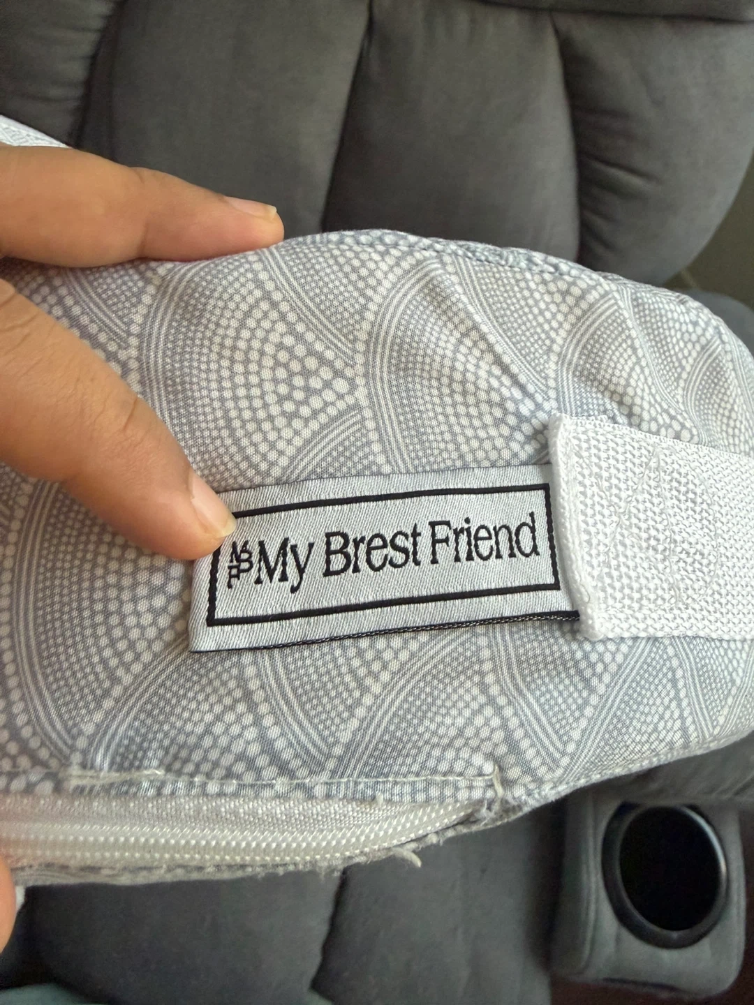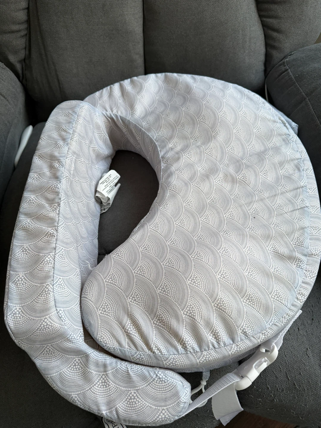 This is a My Brest Friend nursing pillow. It features a soft, adjustable strap for a secure fit. The pillow's cover has a gray and white scale pattern.