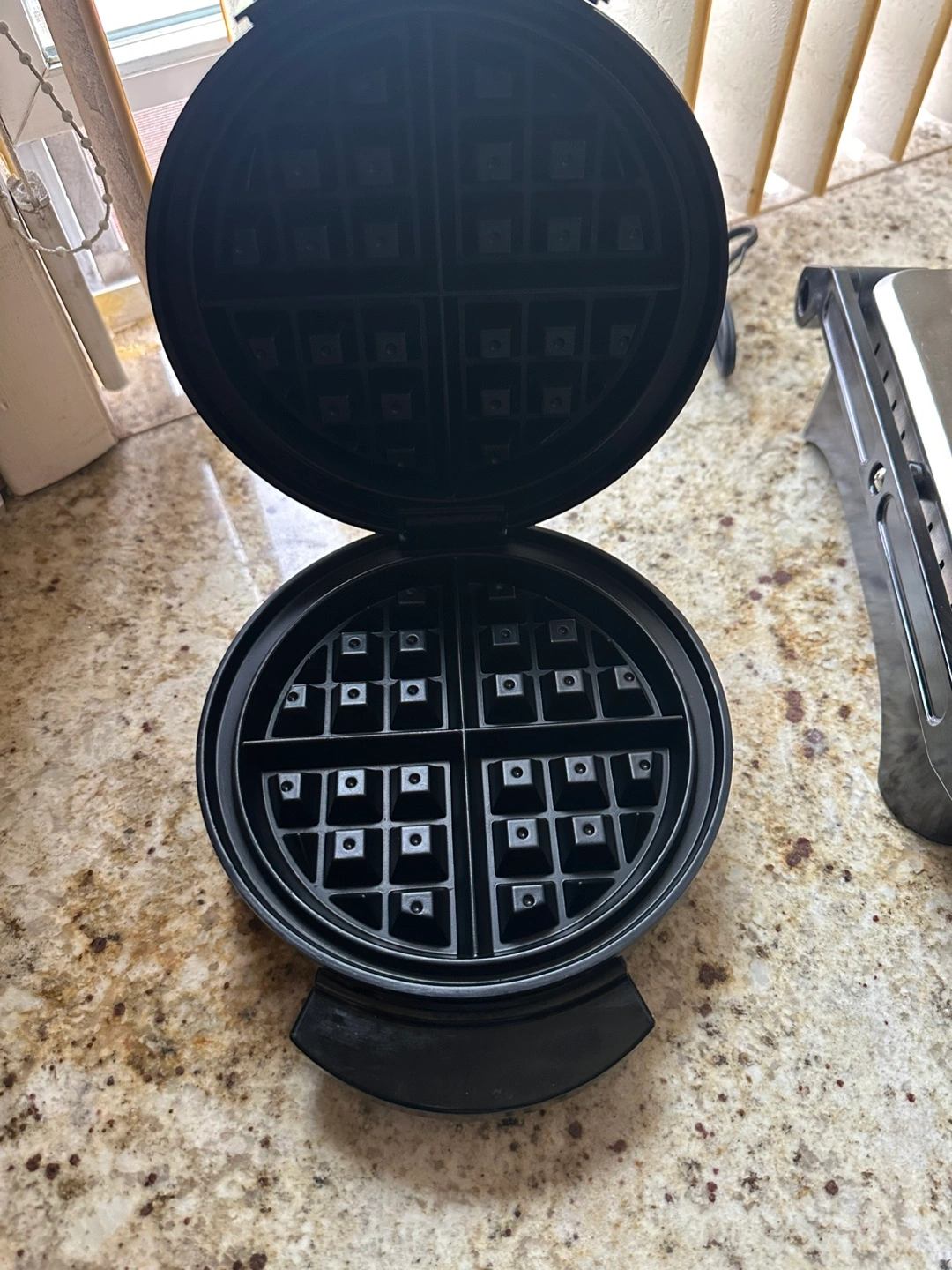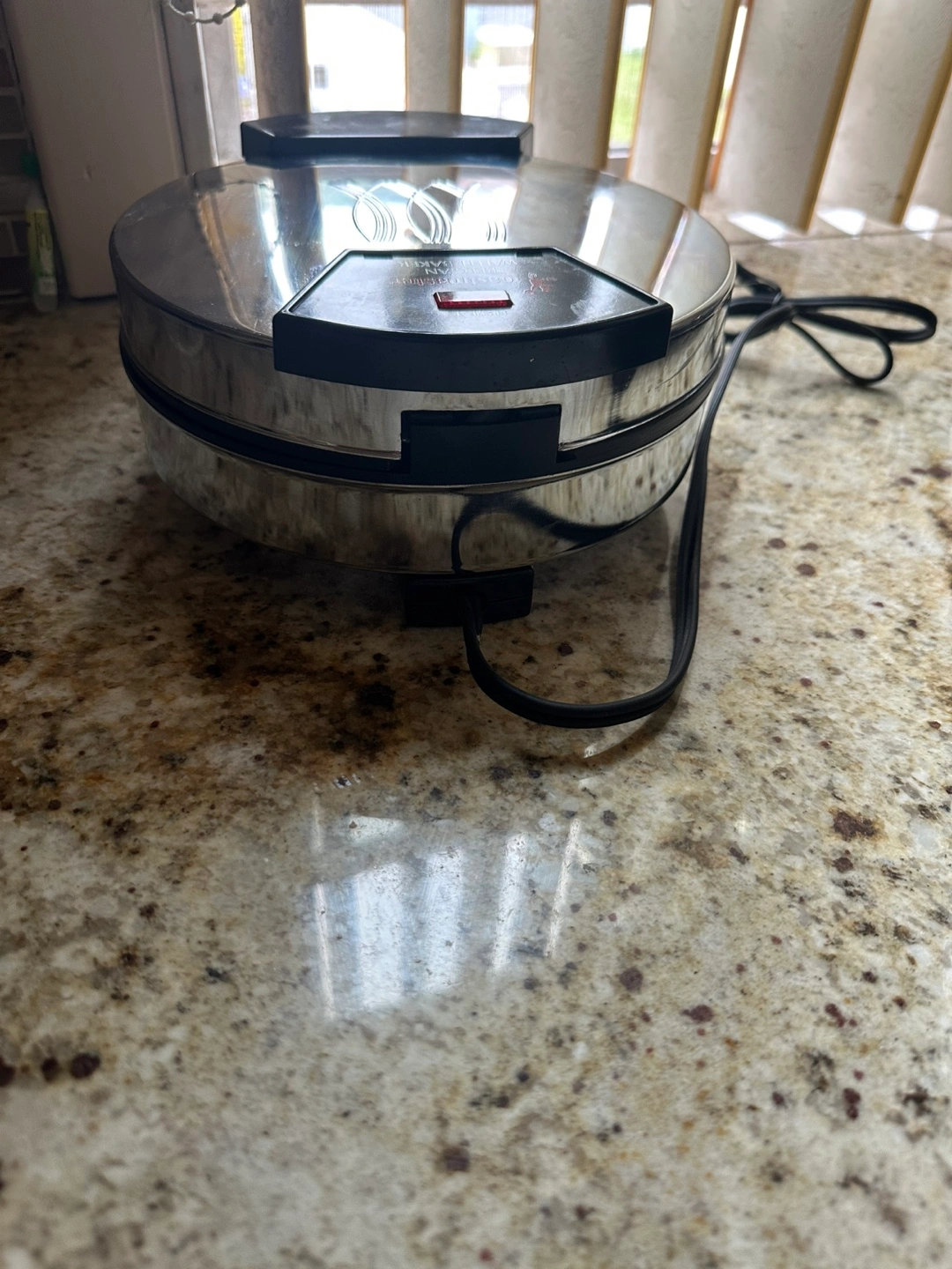 A shiny, round waffle maker. A black handle is located at the bottom. The lid opens to reveal the waffle grids. Enjoy making homemade waffles in your kitchen to begin your day peacefully.