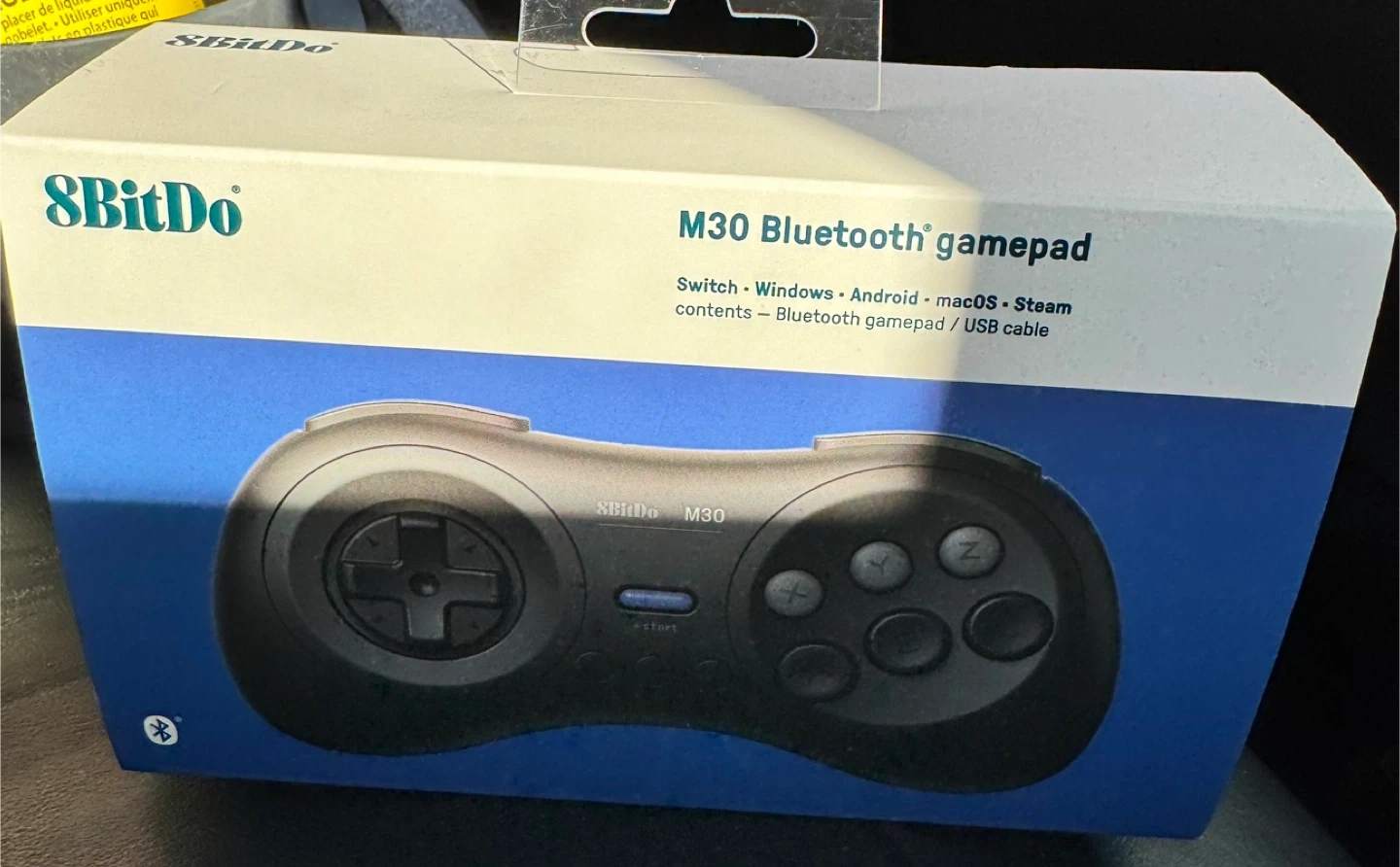 This is the 8BitDo M30 Bluetooth gamepad. It's compatible with Switch, Windows, Android, macOS, and Steam. It connects wirelessly via Bluetooth and includes a USB cable.