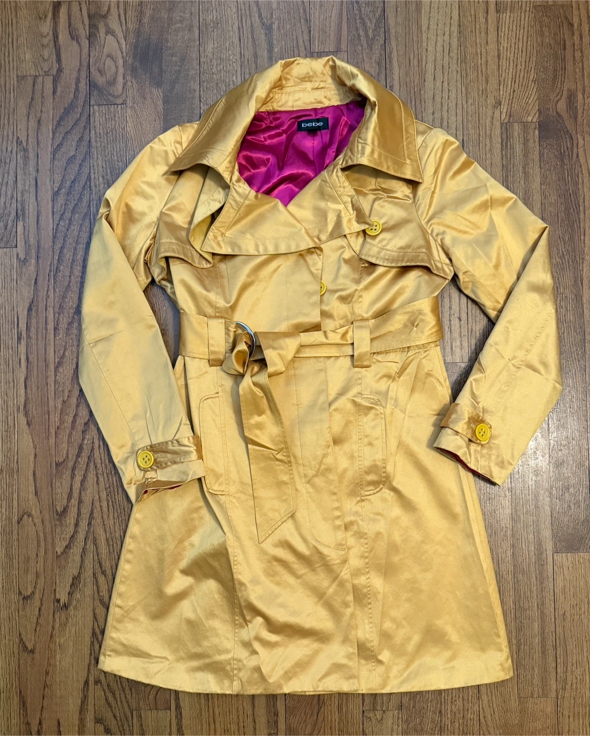 Bebe gold satin double breasted trench coat