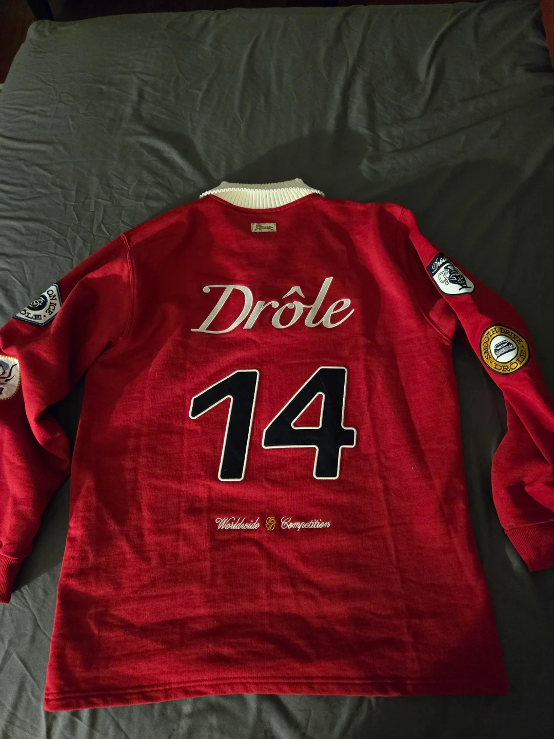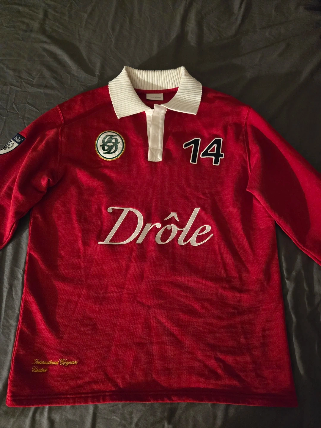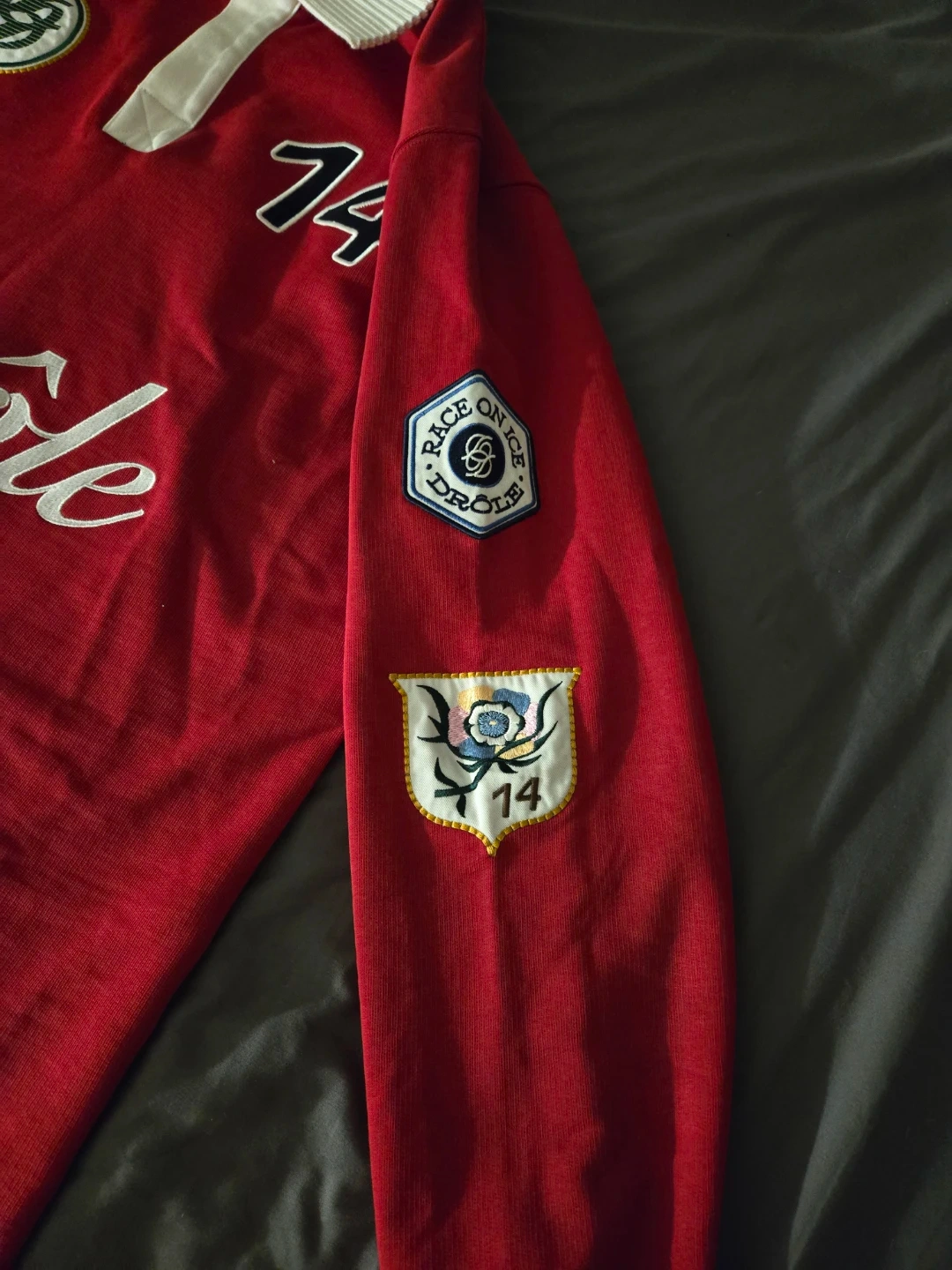 This is a Drôle de Monsieur long-sleeve rugby shirt in red. It features embroidered patches and '14' detailing. The collar is ribbed white with a button placket. Made of cotton.Retail $350