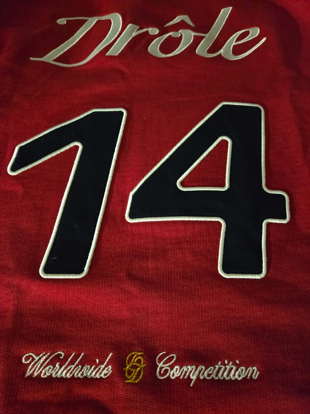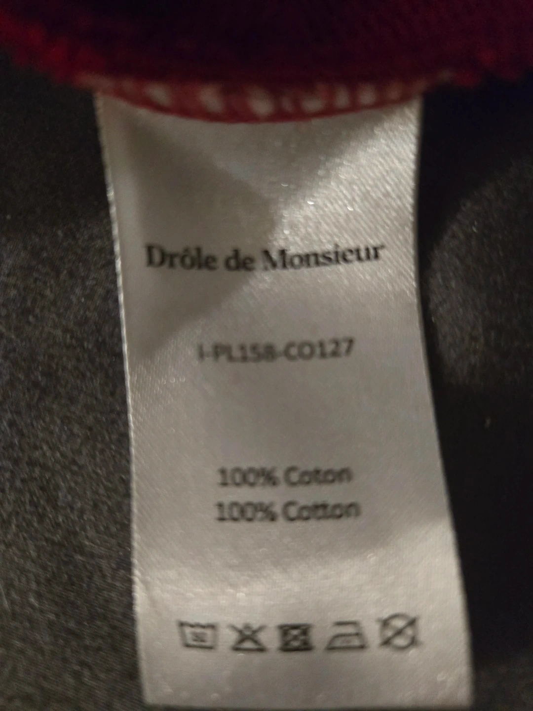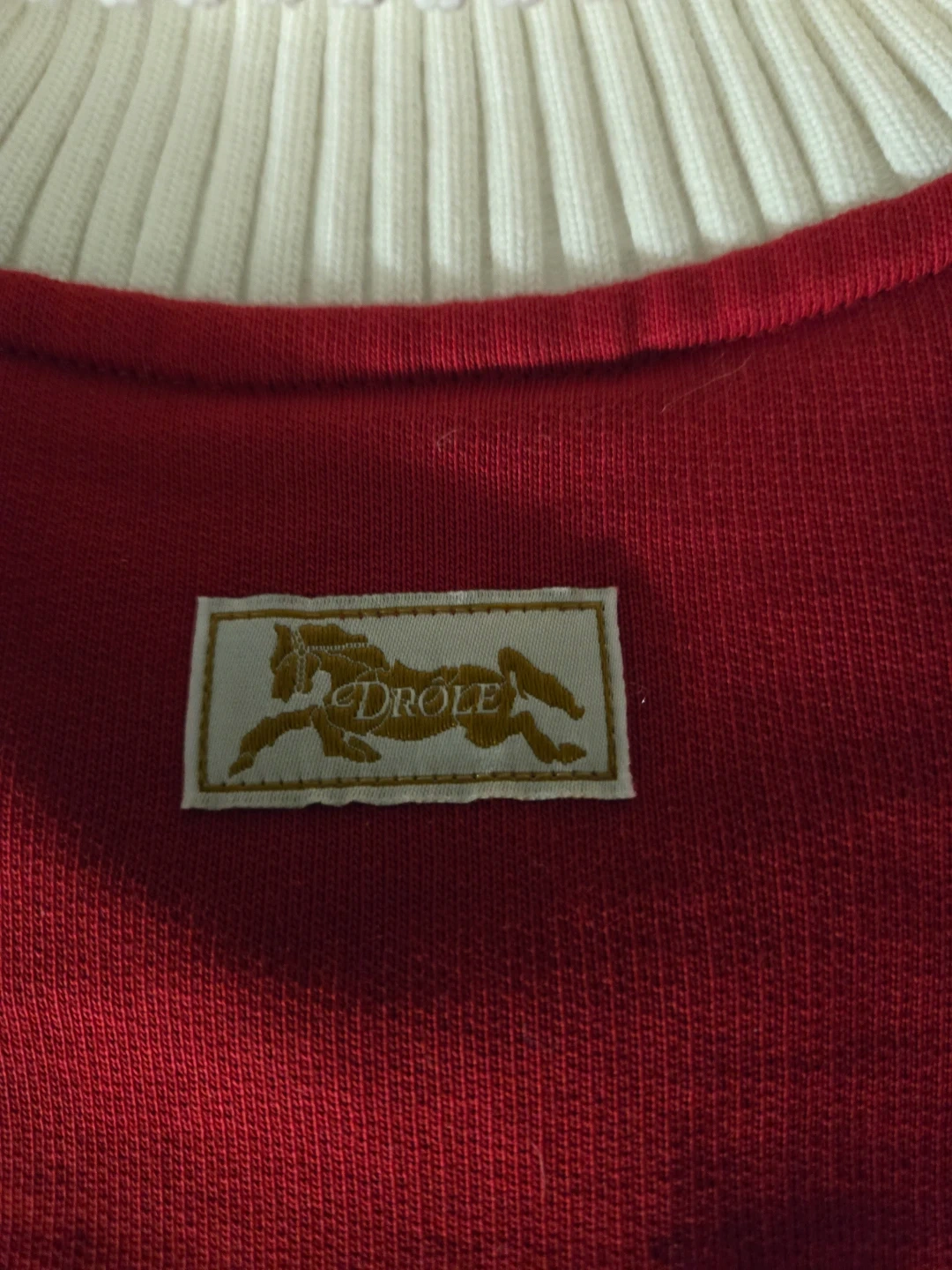 This is a Drôle de Monsieur long-sleeve rugby shirt in red. It features embroidered patches and '14' detailing. The collar is ribbed white with a button placket. Made of cotton.Retail $350