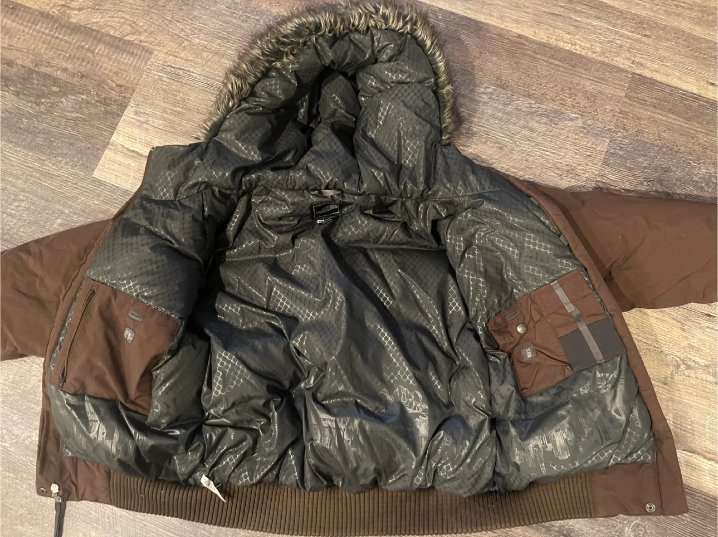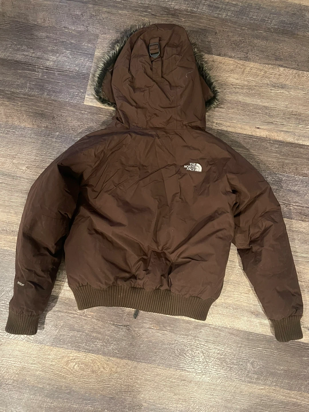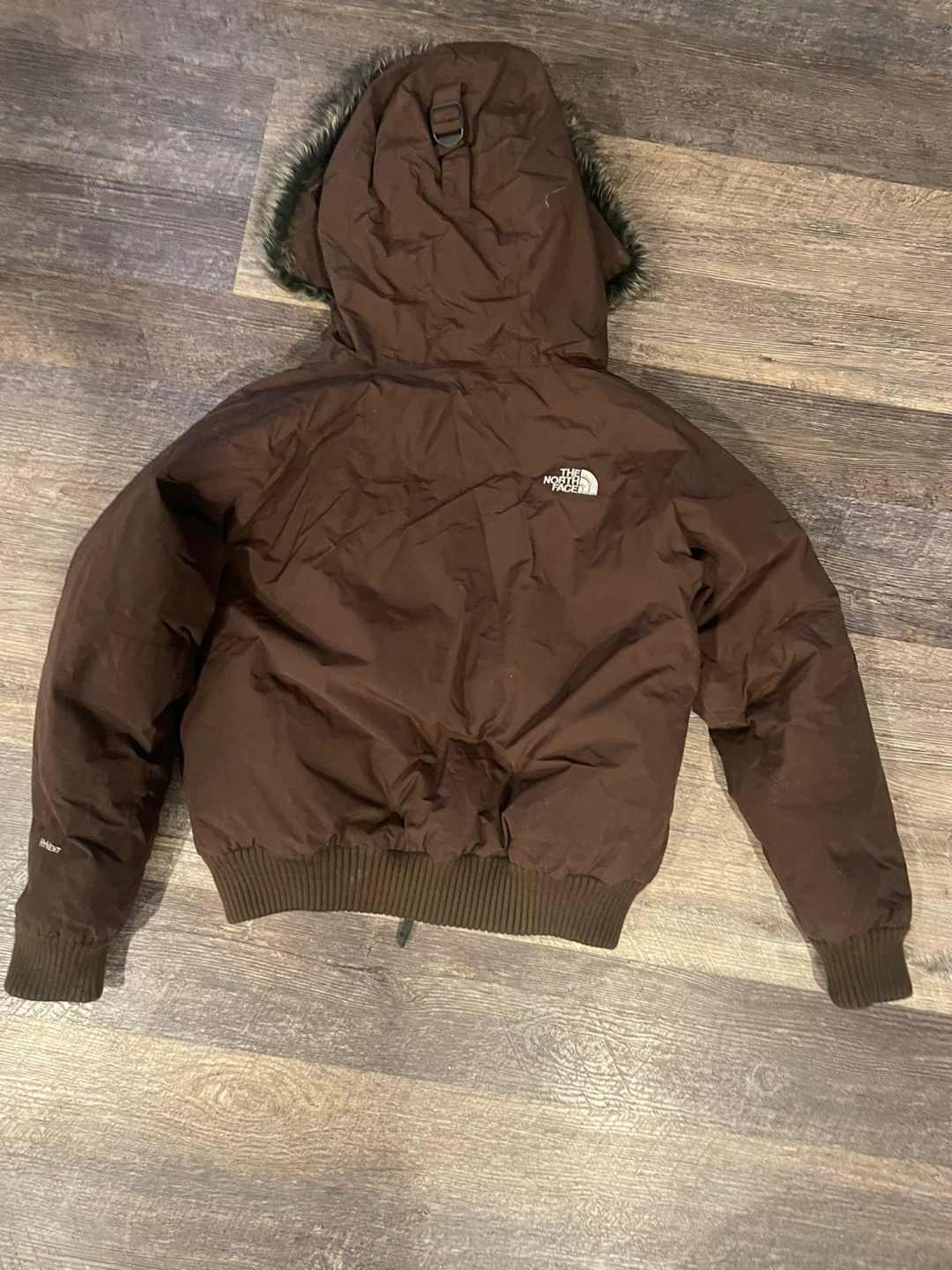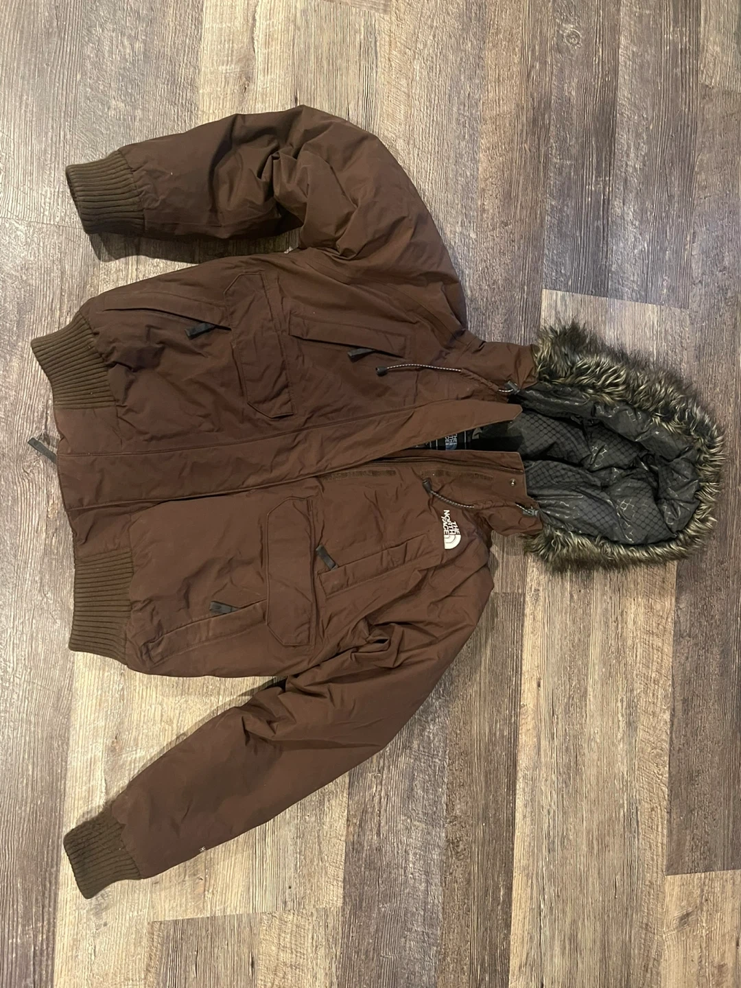 Selling a The North Face HyVent jacket in brown, size medium. It's a women's jacket and has a fur-lined hood. Great for keeping warm!