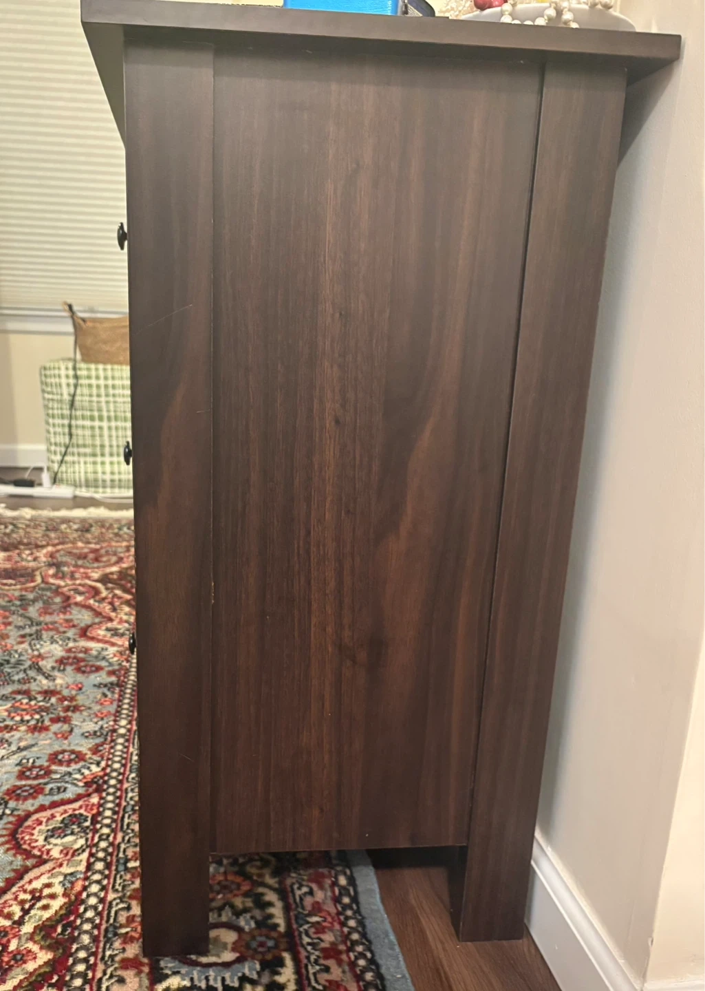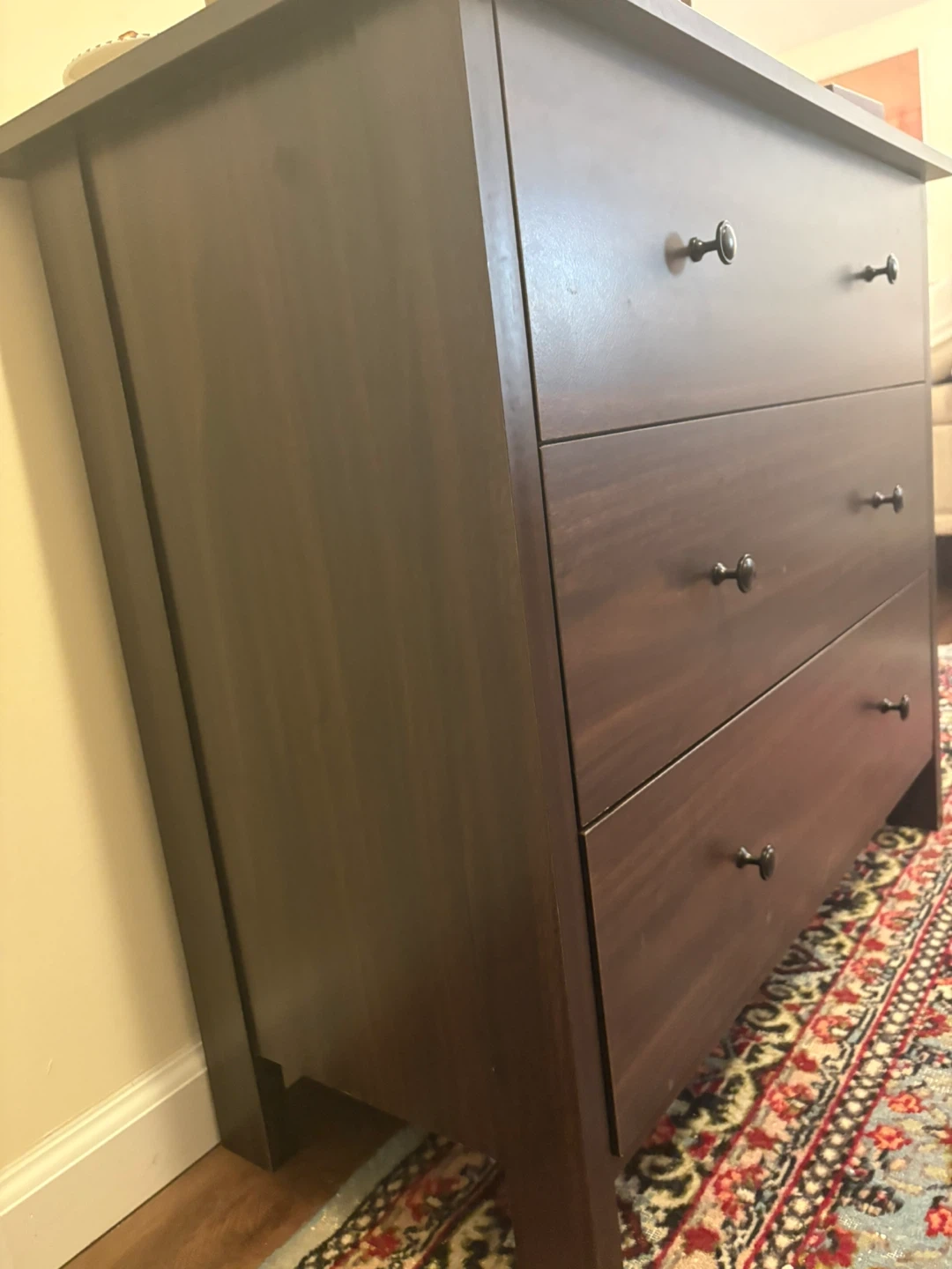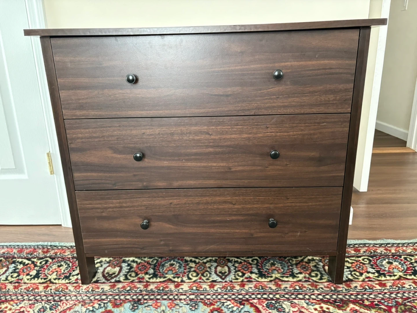 Dark wood finish on this three-drawer dresser. Drawer fronts have black knobs. It's sturdy and functional for bedroom storage.