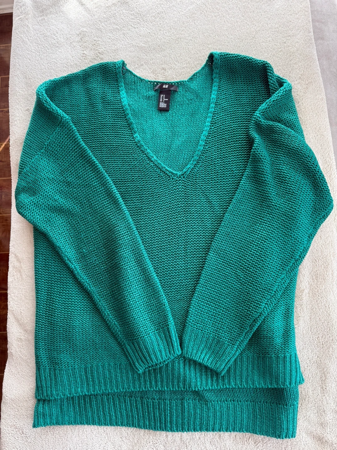 Selling a lovely emerald green knit sweater from H&M! It's a medium loose fit and features a comfortable, relaxed fit with a V-neck. Perfect for layering or wearing on its own during cooler days. The material is soft and cozy, making it a great addition to your wardrobe!
