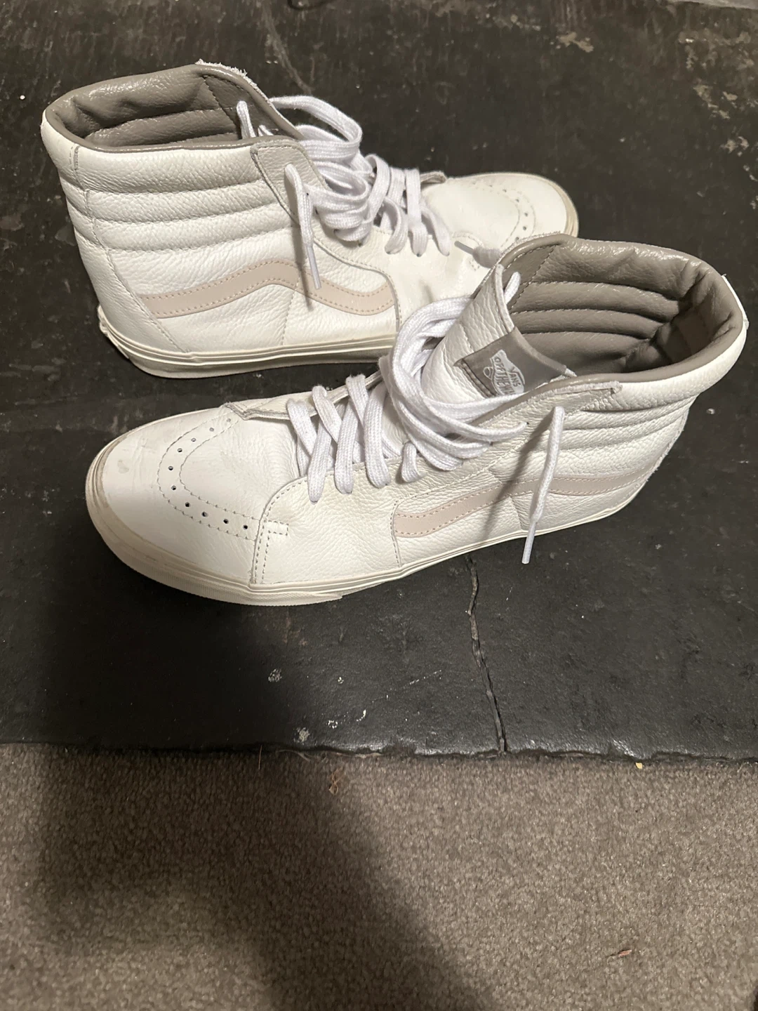These are Vans Sk8-Hi high-top sneakers in white leather. They feature the iconic Vans side stripe in a subtle light pink. The interior lining is gray. Leather upper.