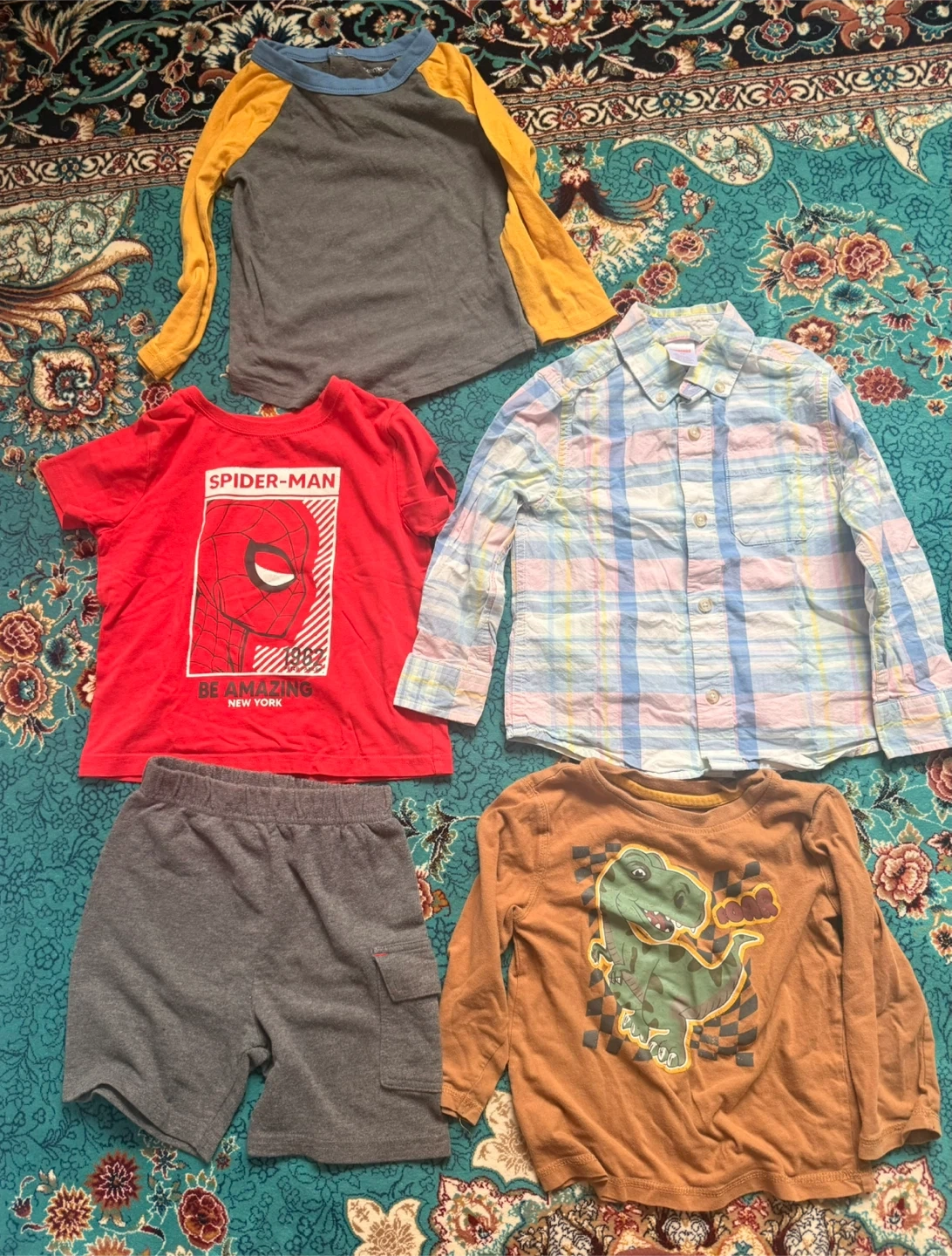 Bundle of boys' tops and short for everyday wear. Includes a red Spider-Man graphic tee and grey cargo shorts. Also features a plaid button-down shirt and a long-sleeved brown shirt with a dinosaur graphic. Great for a kid's wardrobe refresh! They are all 3T. Price total is $20