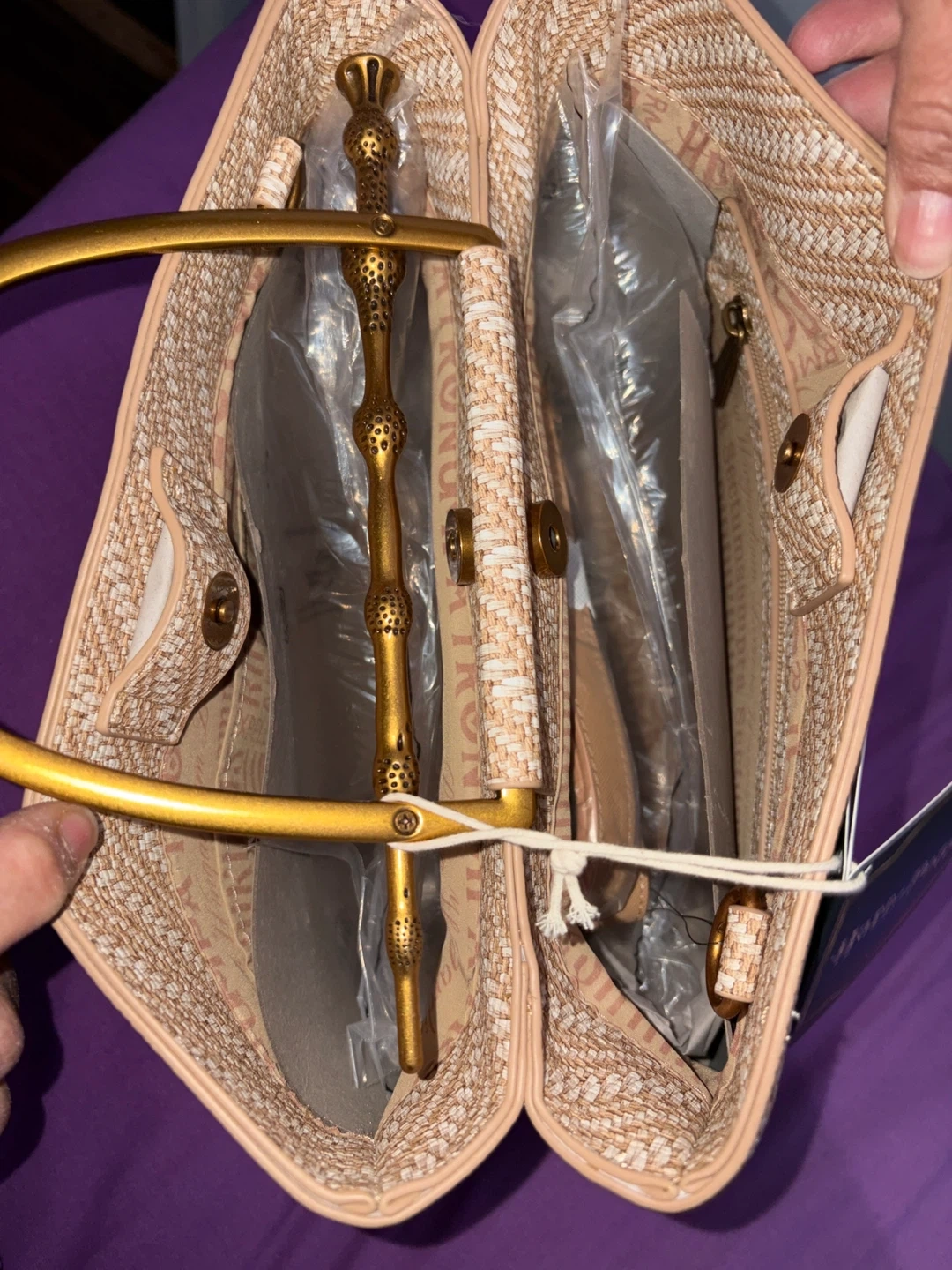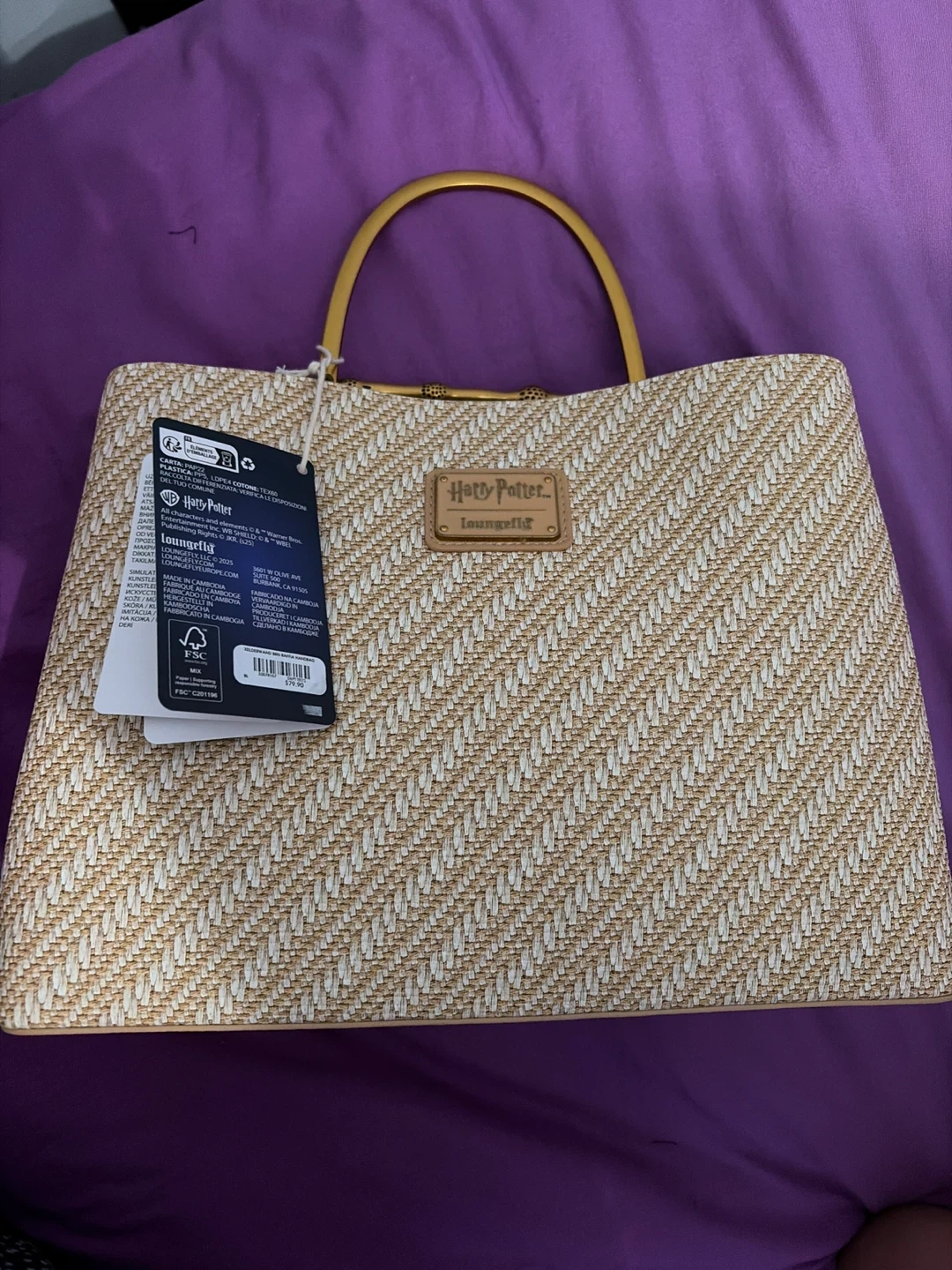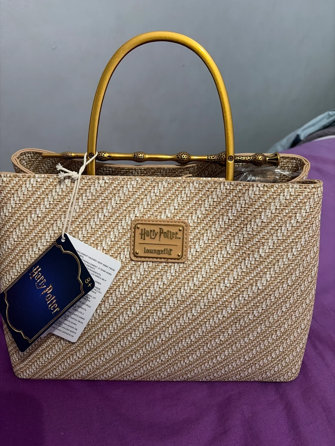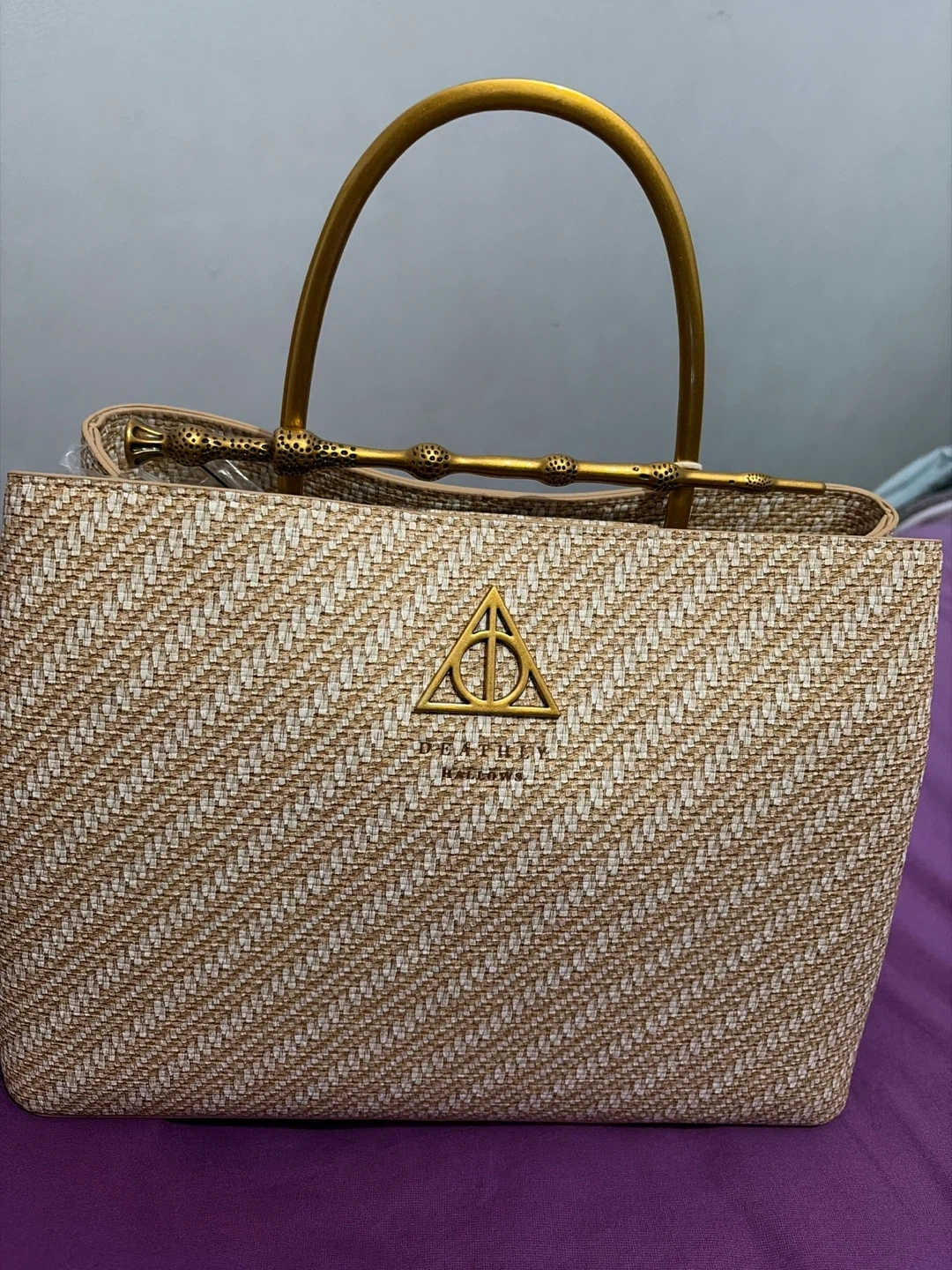 This stylish straw tote bag features the Harry Potter Loungefly collection. It's decorated with the Deathly Hallows symbol and has unique bamboo-style handles. A great bag for any wizarding world fan!