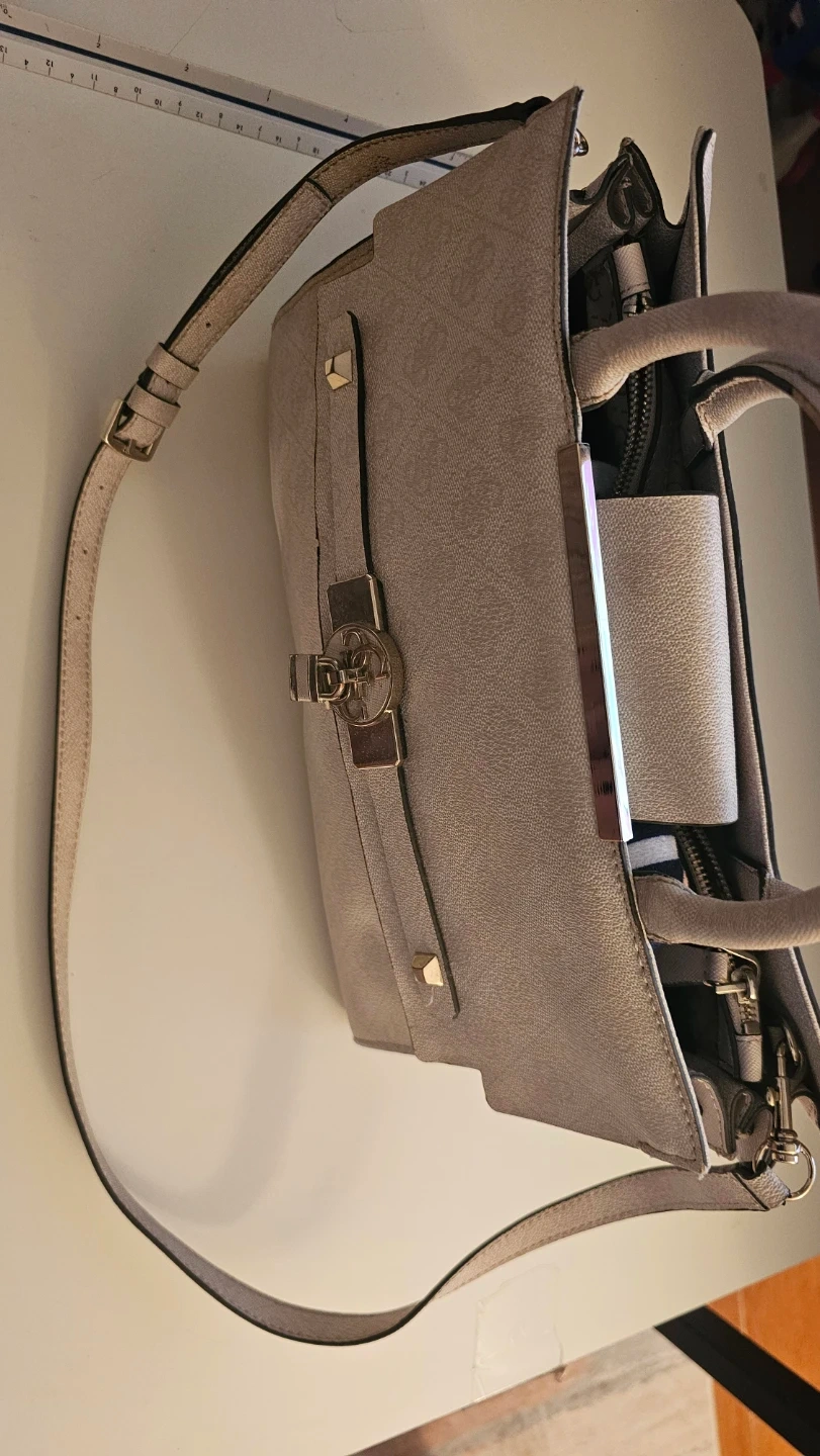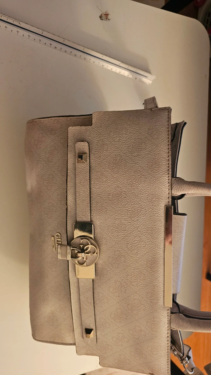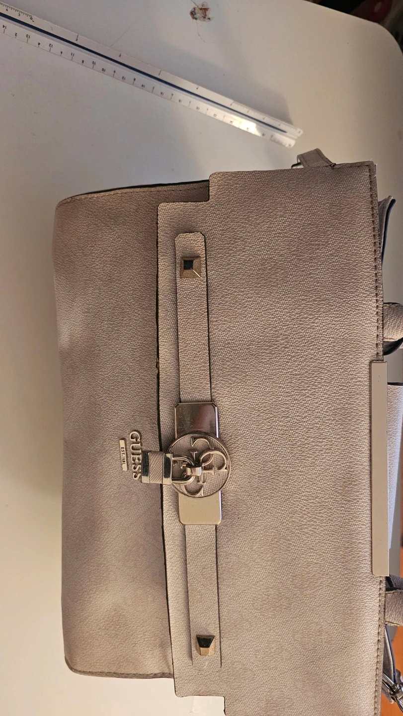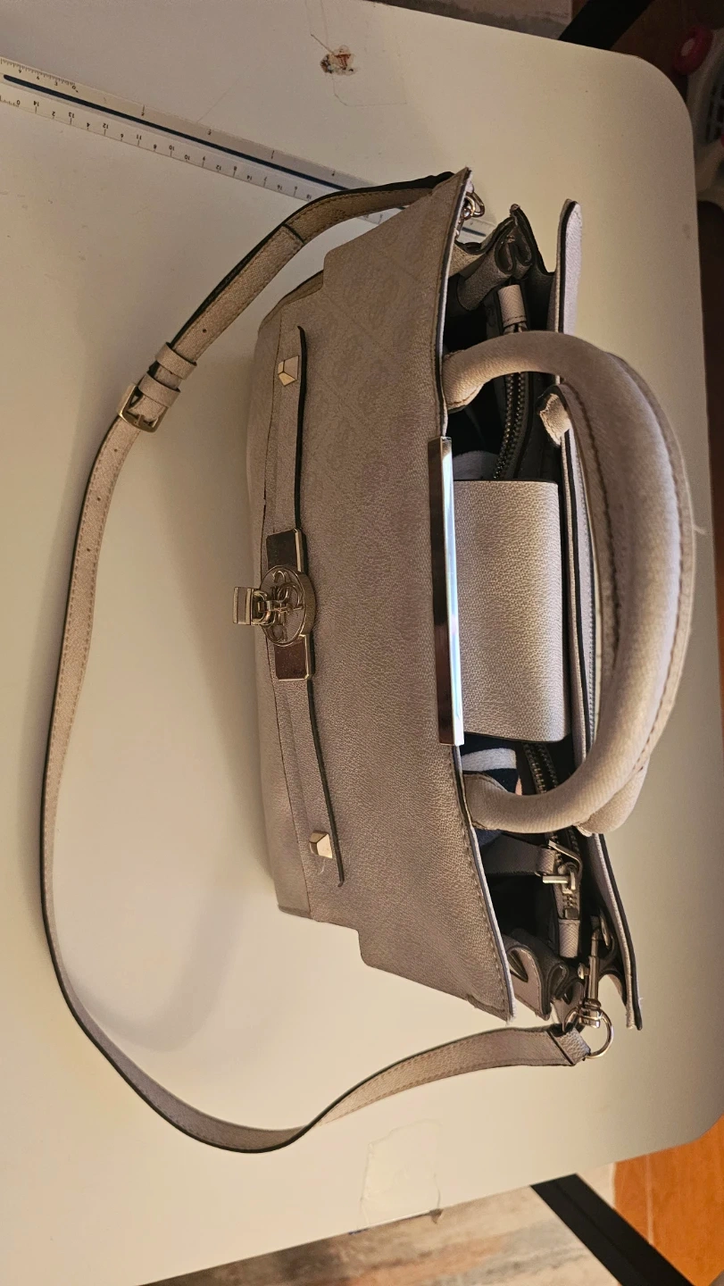 Stylish beige crossbody and tote bag by GUESS. Faux leather material with gold-tone hardware. Features a secure turn-lock closure and two top handles. Interior includes a zippered pocket.