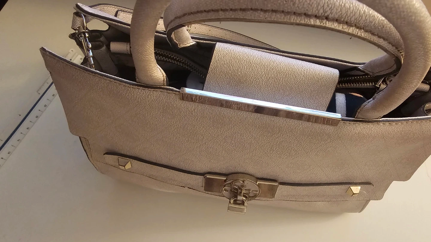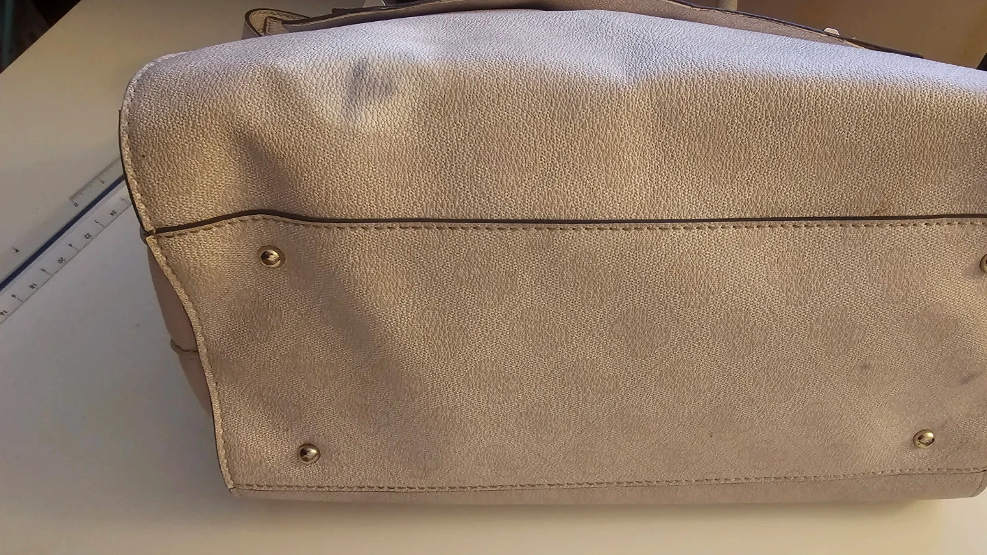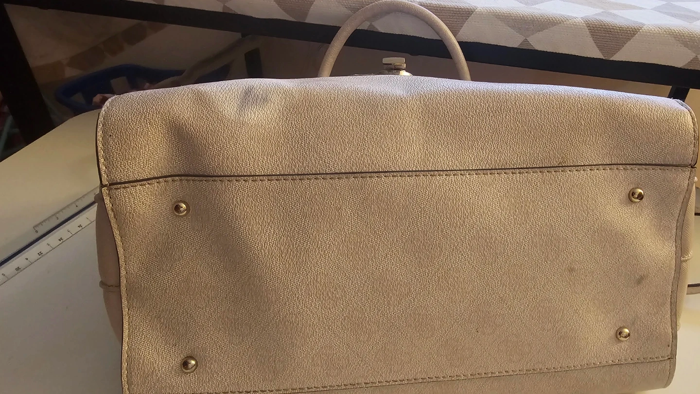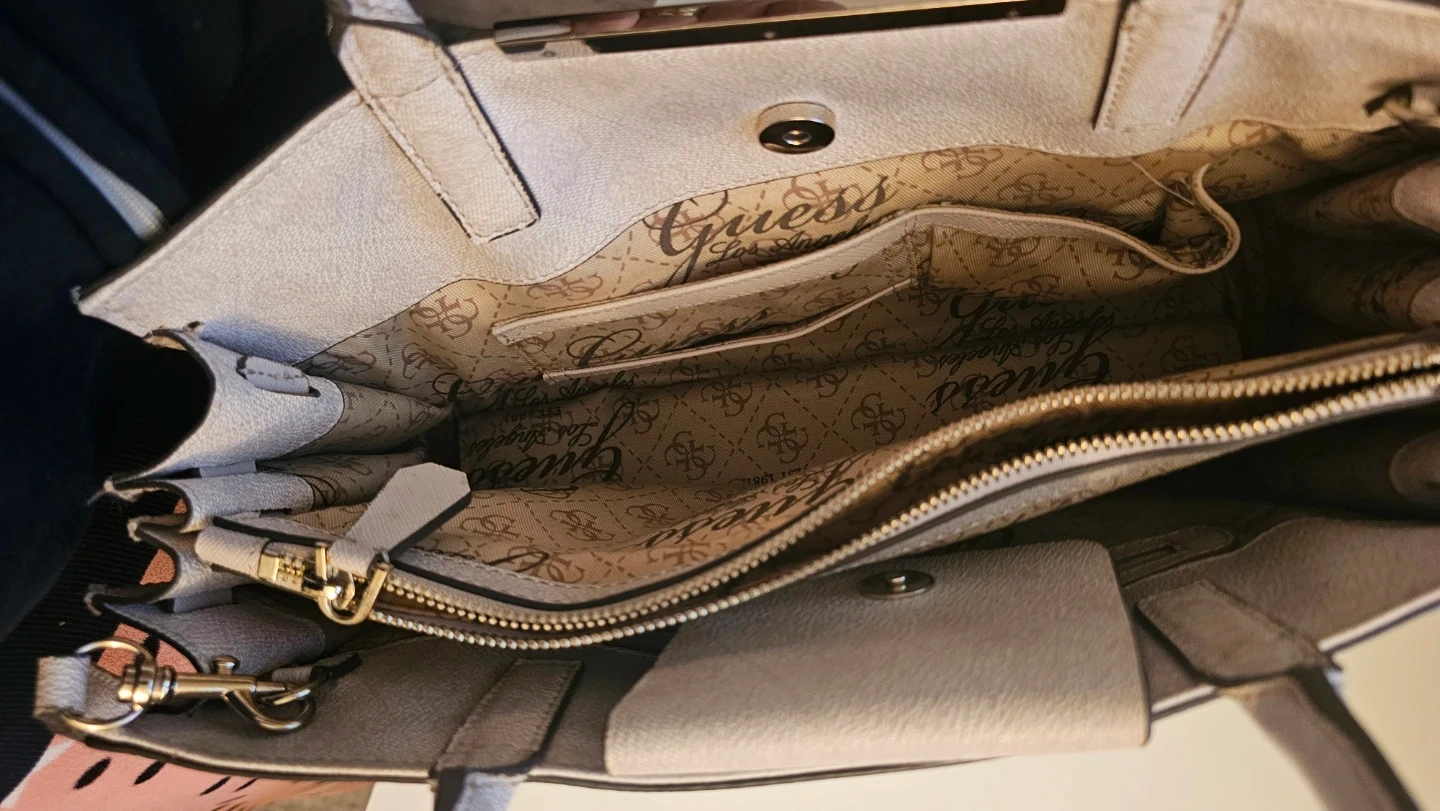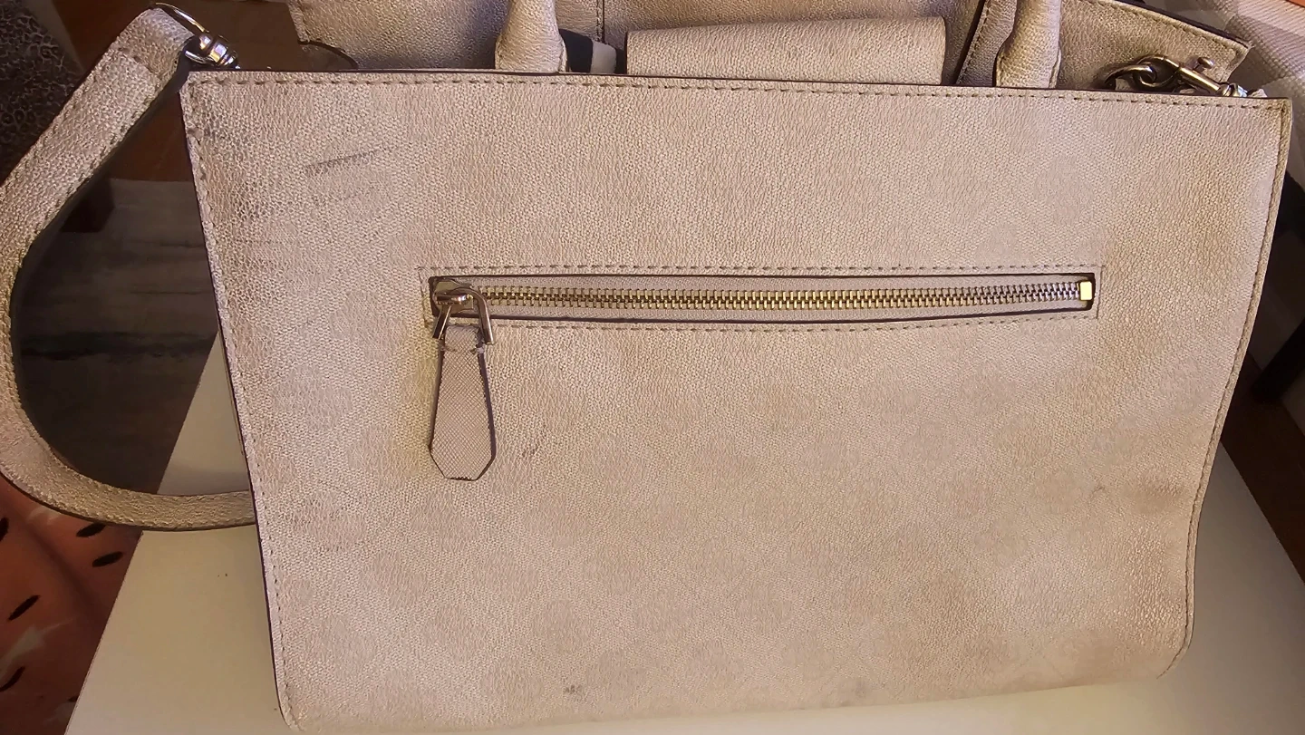 Stylish beige crossbody and tote bag by GUESS. Faux leather material with gold-tone hardware. Features a secure turn-lock closure and two top handles. Interior includes a zippered pocket.