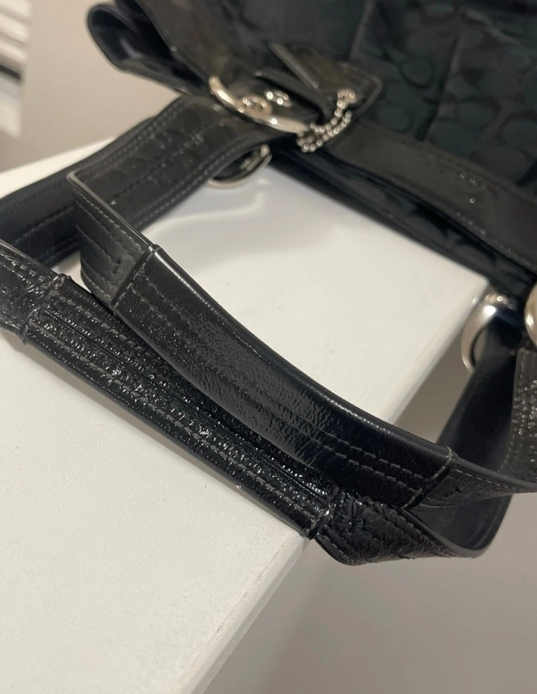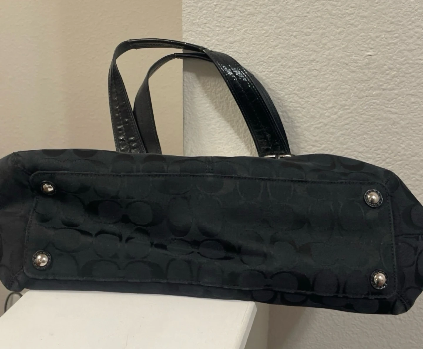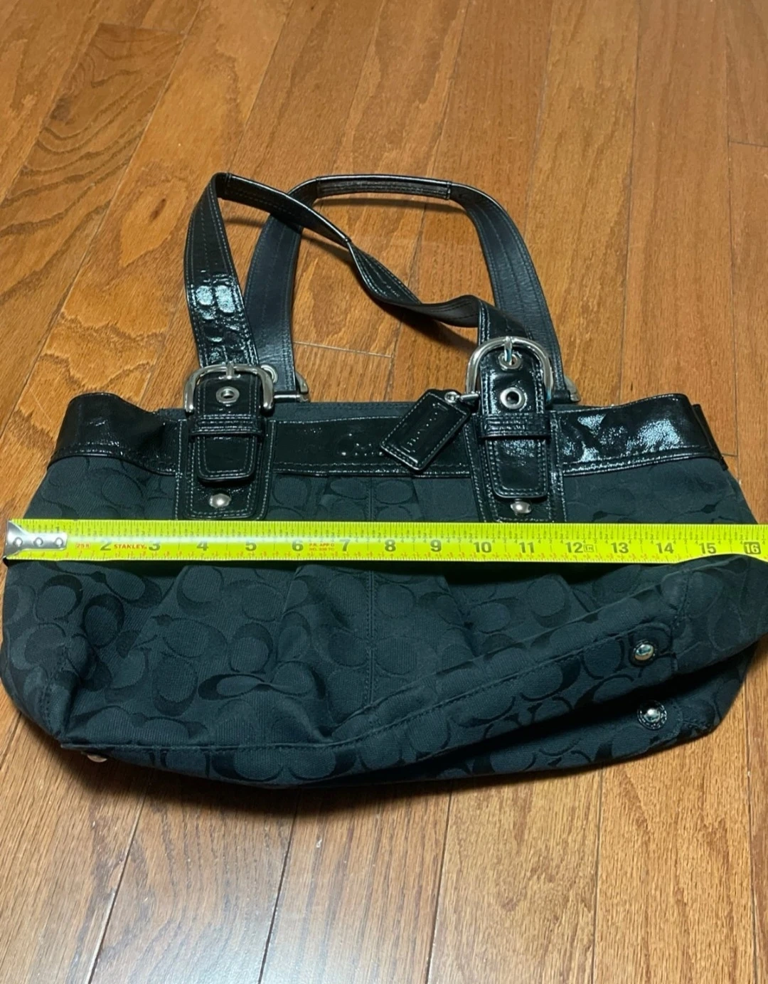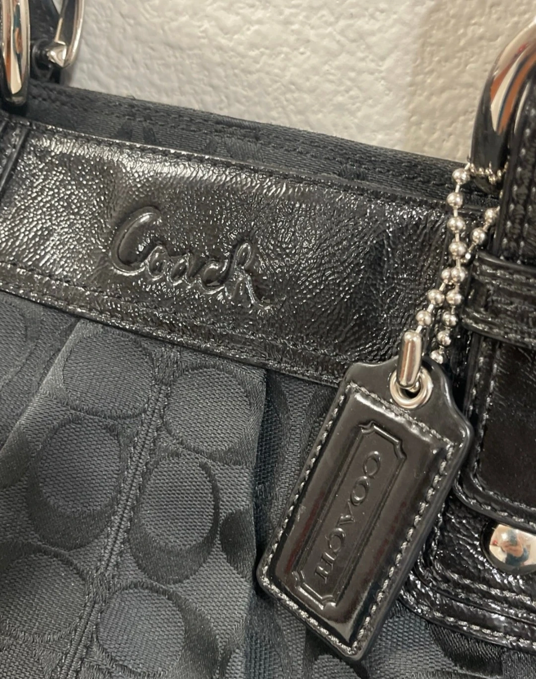 This is a black Coach tote bag with the signature C pattern. It's made from durable fabric and features patent leather accents. Includes the original Coach leather hangtag.