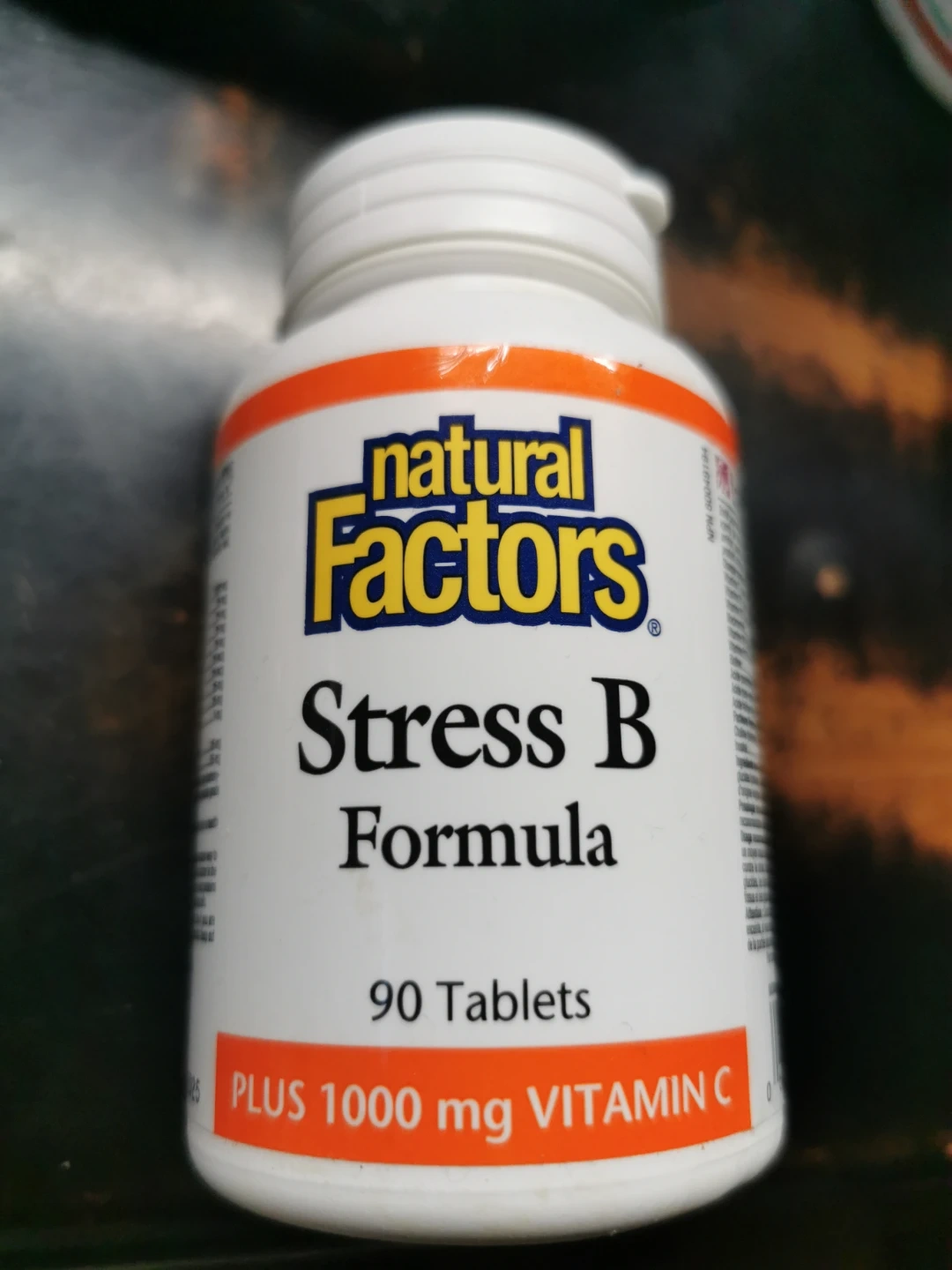 Natural Factors Stress B Formula with 90 tablets. Includes 1000 mg of Vitamin C. Expiry date is November 2025. Contains B vitamins (thiamine, riboflavin, niacin, B6, B12), folic acid, and pantothenic acid. Also contains choline and inositol. Formulated and packaged in Canada. Expired 2025 Nov