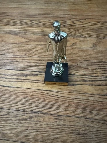 The Office Dundee Award Trophy is a unique memorabilia item that pays tribute to the popular television show "The Office." This trophy serves as a collectible piece for fans of the show, featuring a design inspired by the quirky and charming atmosphere of the television series. Perfect for adding a touch of nostalgia or showcasing one's love for "The Office," this trophy is a must-have for any television memorabilia collector. Feel free to text me at 347 208 6237 with your name and the item you're interested in, and I'll get back to you as soon as I can. Let me know if you need more pictures or a video!