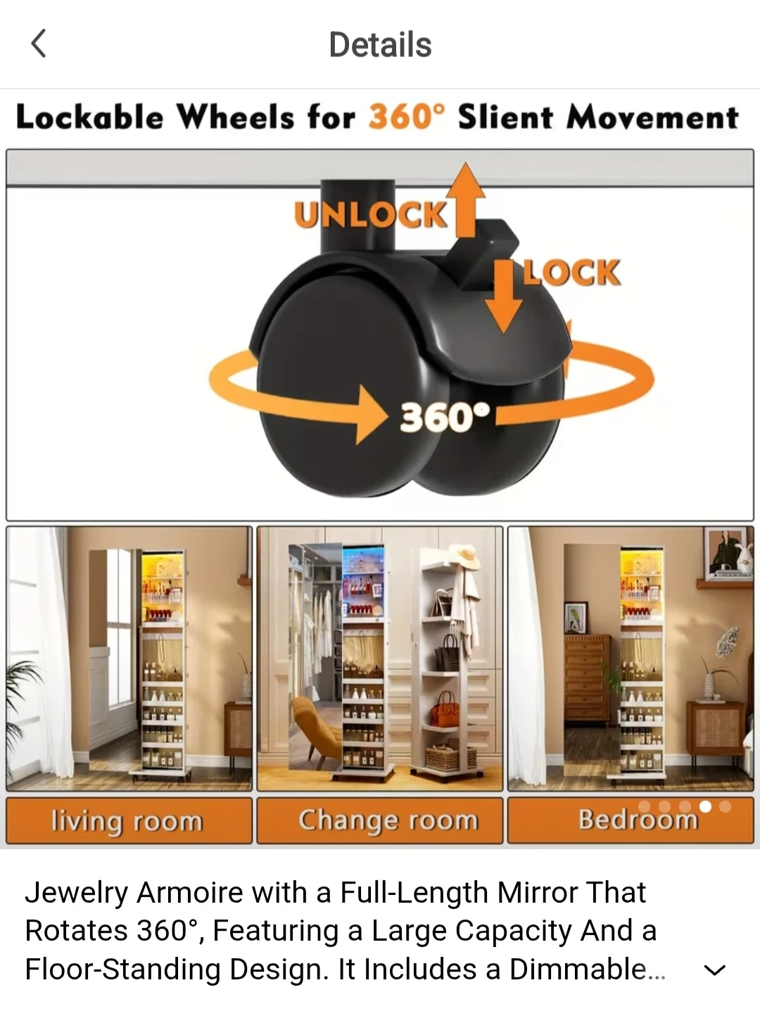 This jewelry armoire features a full-length mirror that rotates 360 degrees. It has a large capacity and a floor-standing design with lockable wheels. Includes a dimmable LED light.