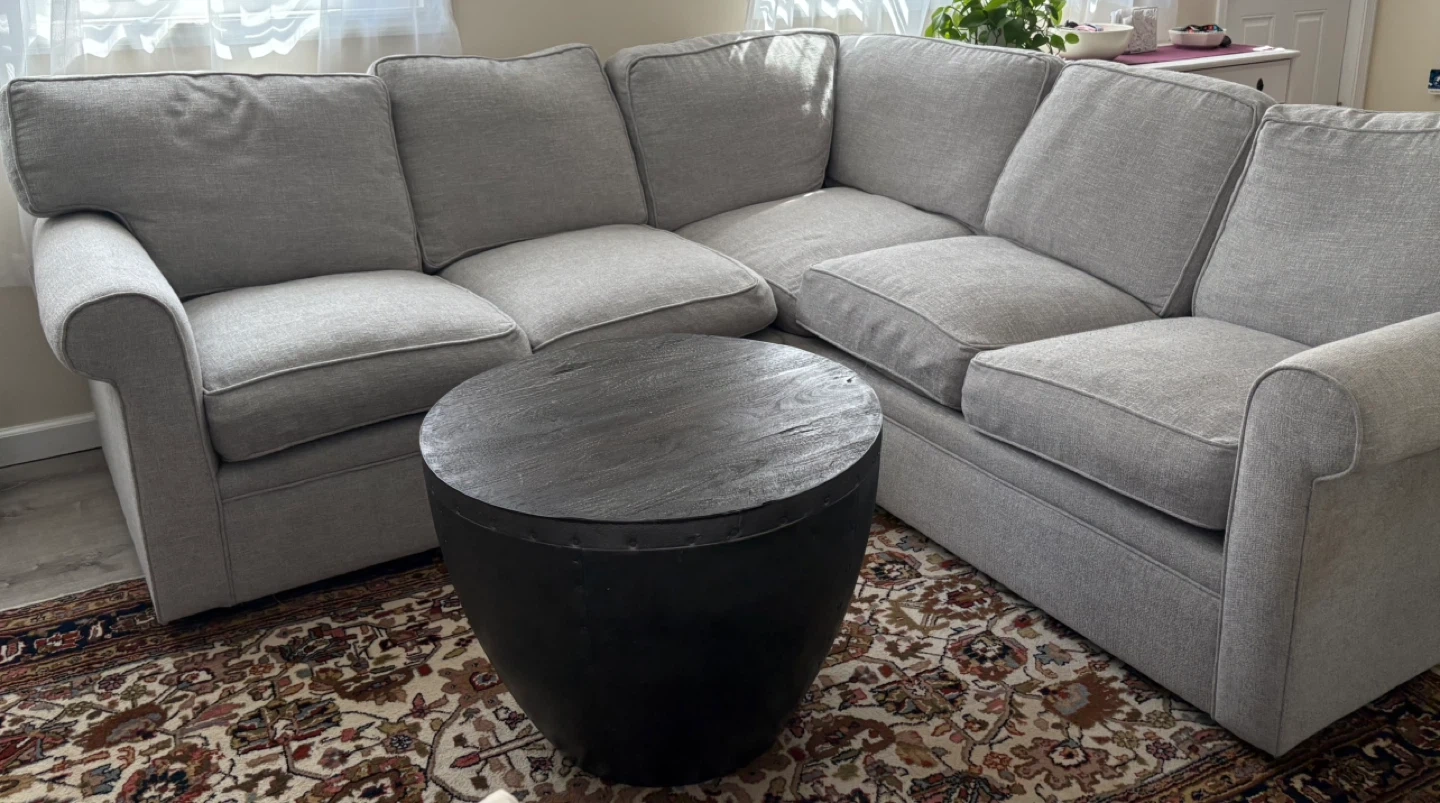 Comfortable light gray sectional sofa. Features plush cushions and rolled arms. Upholstered in a durable fabric. It's a great centerpiece for any living room!