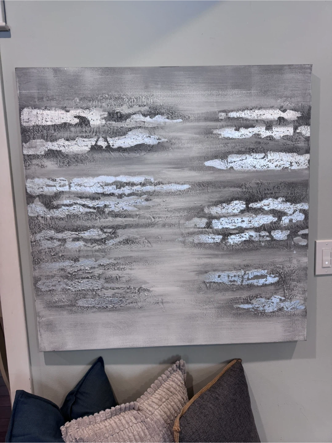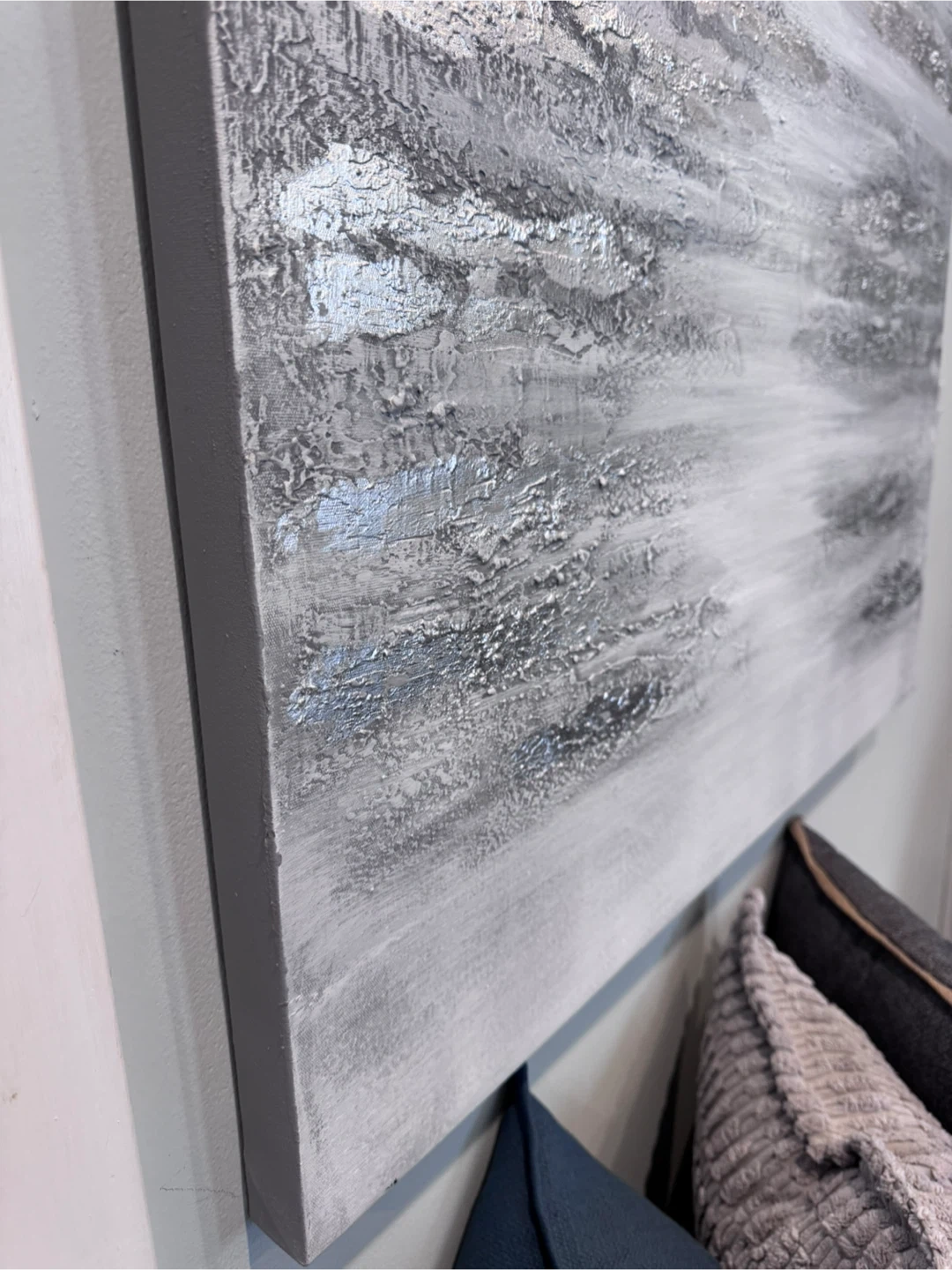 A textured abstract painting in shades of grey and white with metallic accents. This canvas art adds a modern touch to any room. Great for neutral palette.