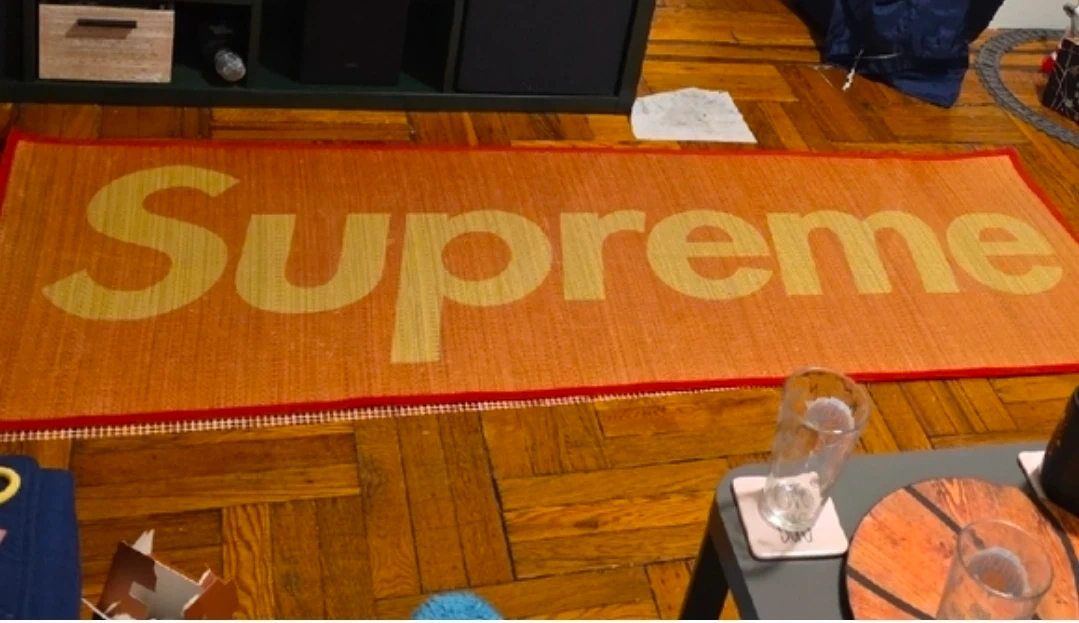 This is an authentic Supreme logo mat. It features the iconic Supreme branding in a large, bold font. This mat's woven texture adds visual interest.