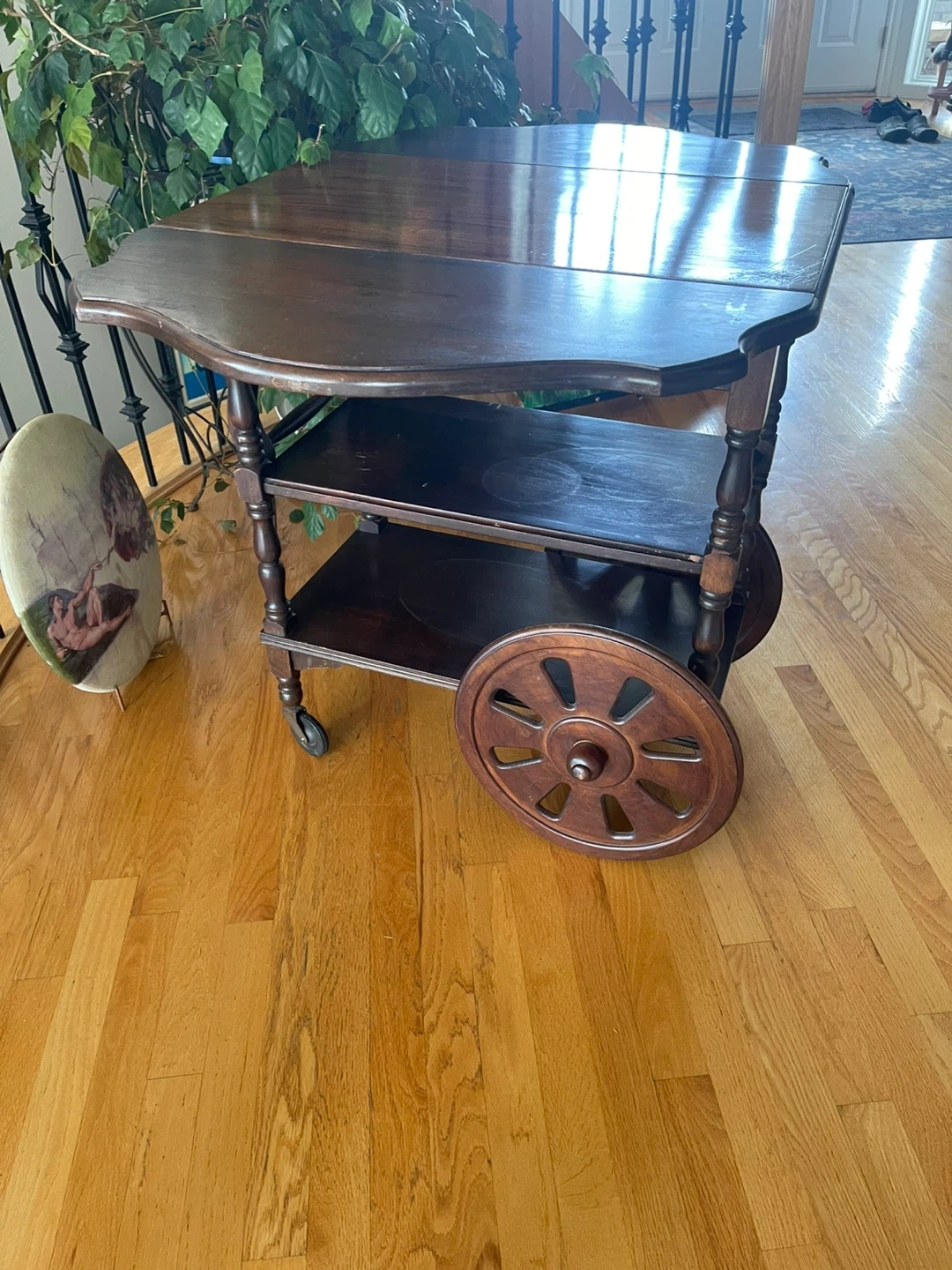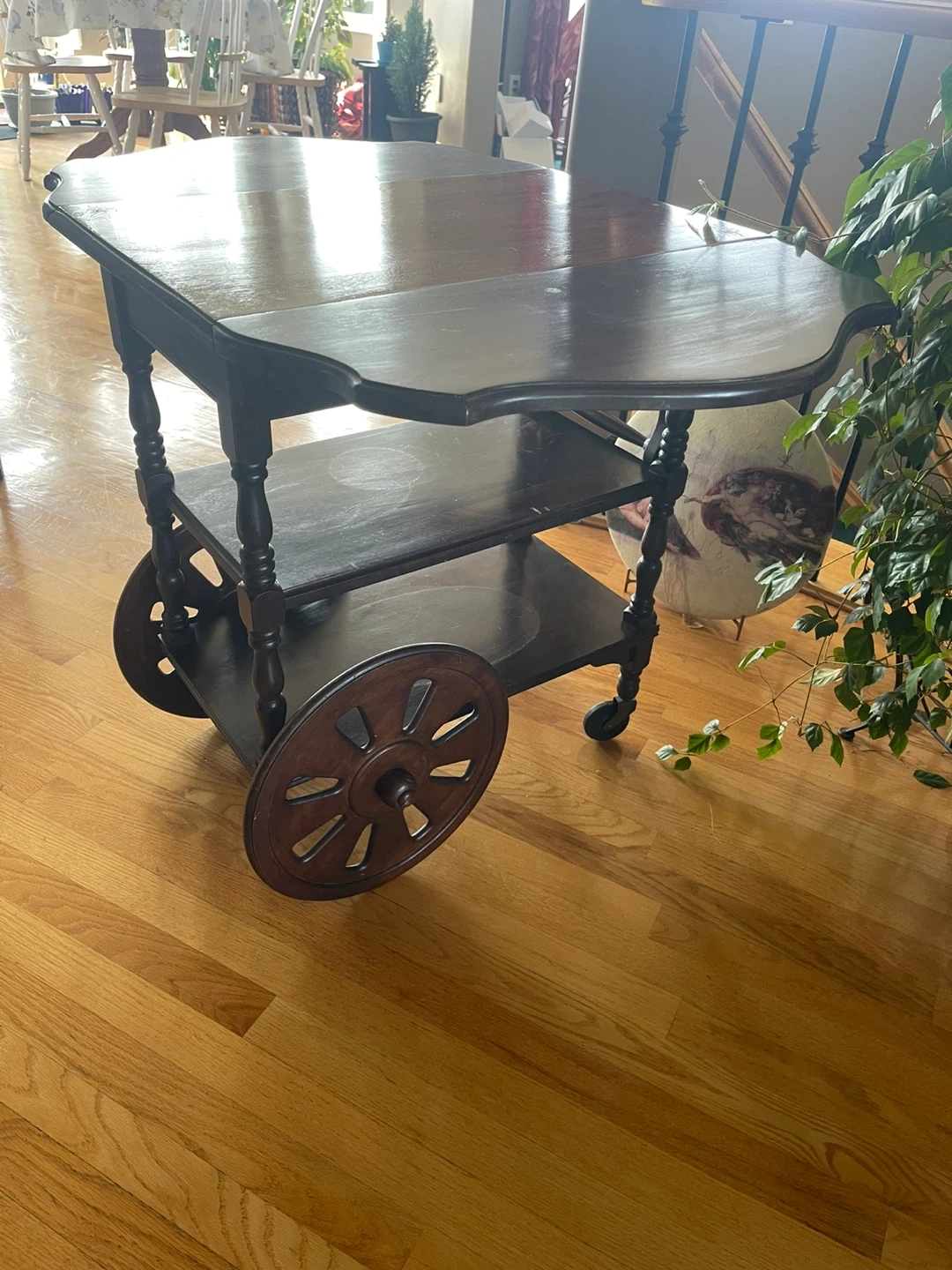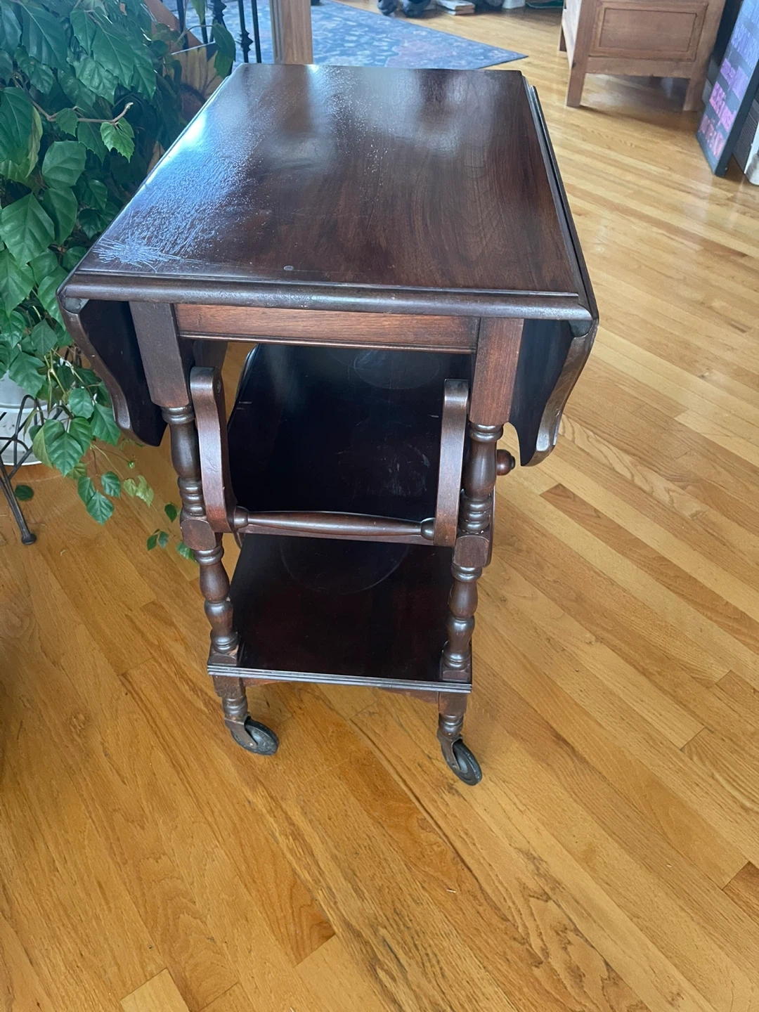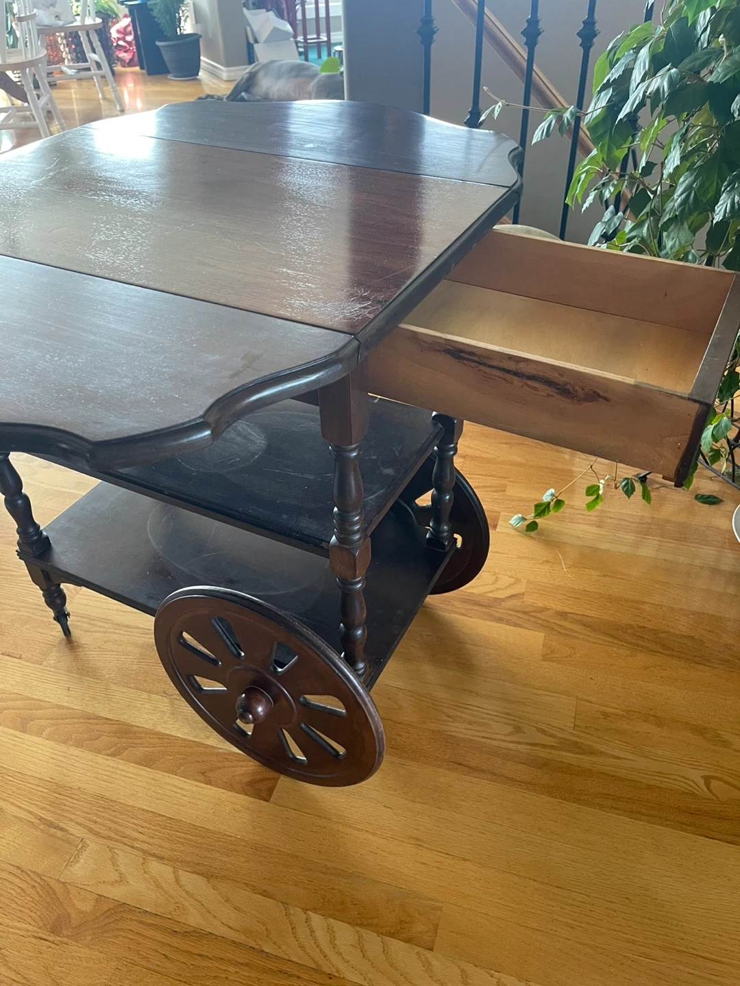 This vintage wooden serving cart features drop leaves for adjustable surface space. It has two shelves and decorative wheels. Crafted from dark wood, it's a charming addition to any dining or living area. Has one drawer. Its wheeled design makes it easy to move around.