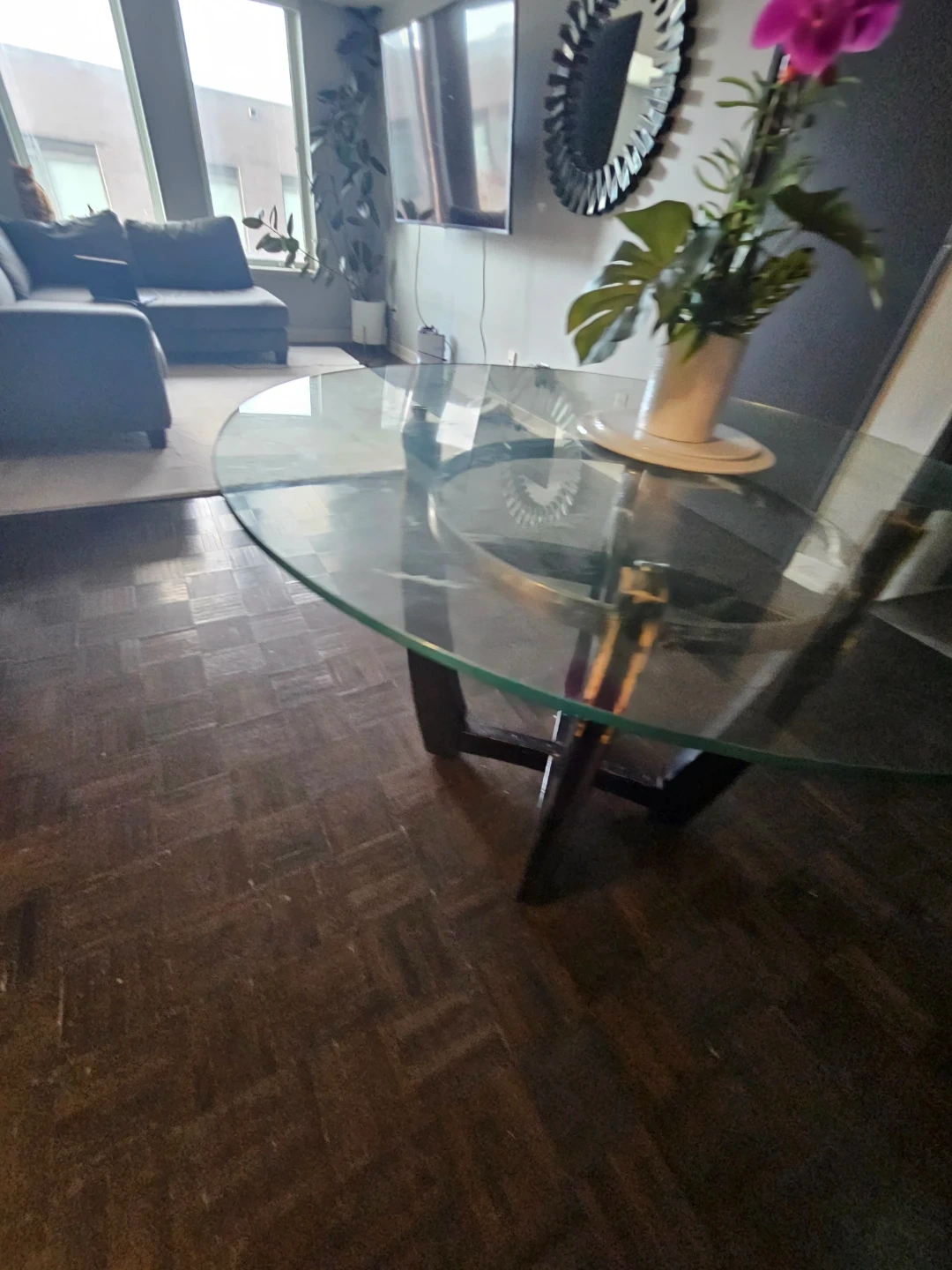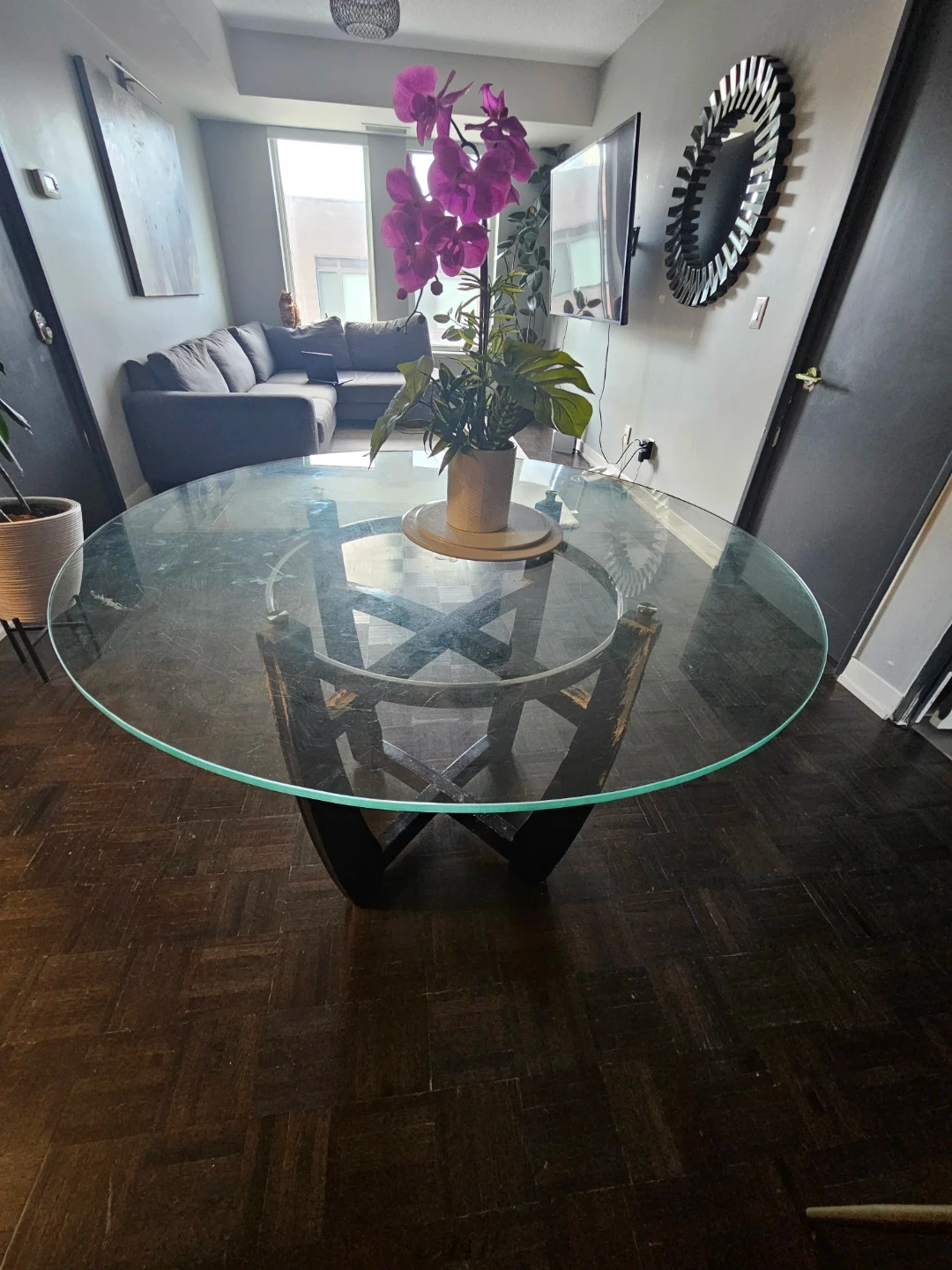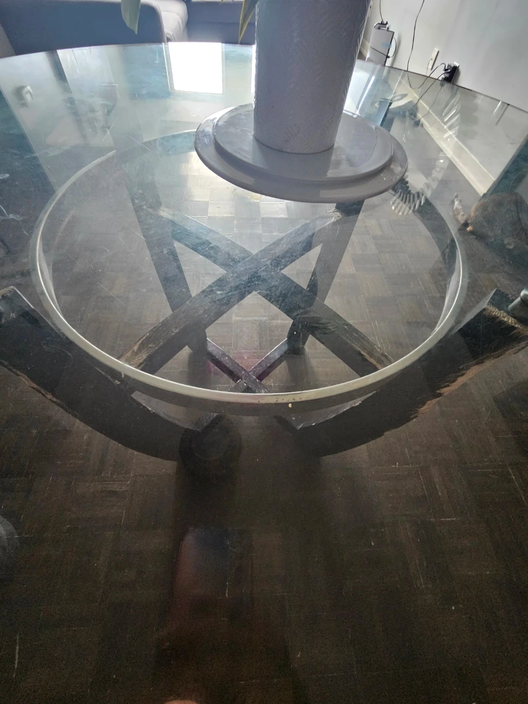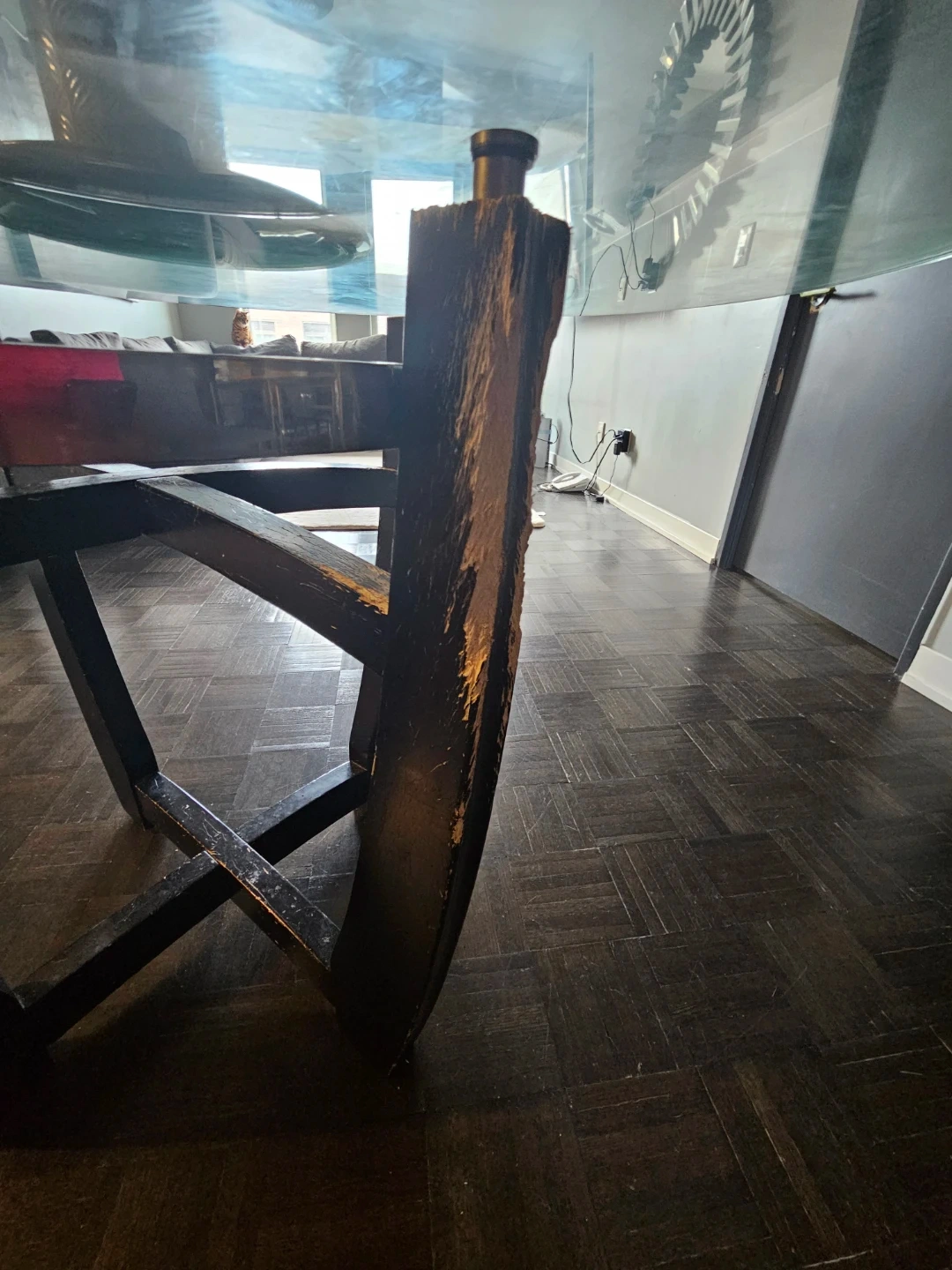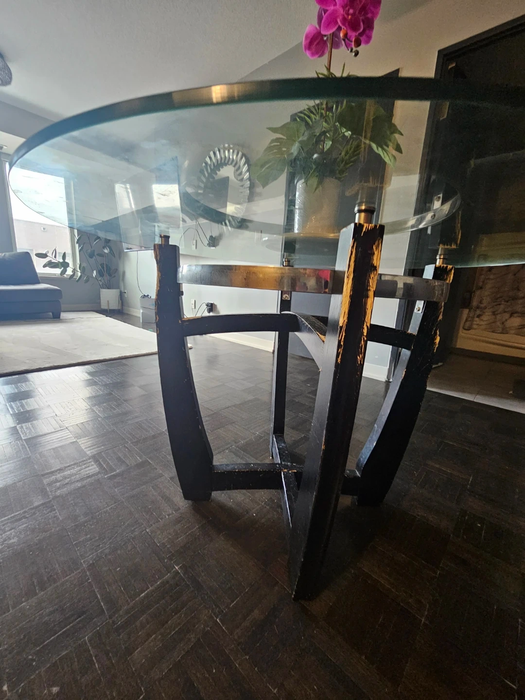 This is a stylish round dining table with a clear glass top and a dark wood base. It's perfect for small to medium-sized dining spaces. The base has a unique criss-cross design. Giving away for free to anyone that cares to fix it up as my cat used it as their scratch pad.