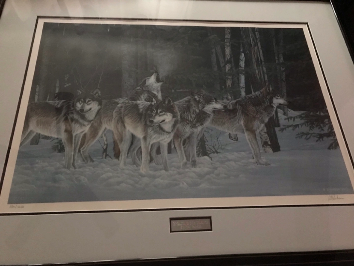 Framed limited edition print. Numbered 386/1250. Signed by the artist. Depicts wolves howling in a snowy forest. No delivery. No holds. As is no refunds. Price is firm.