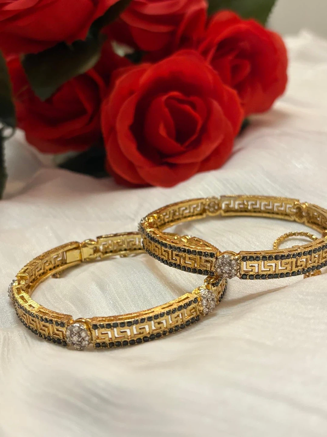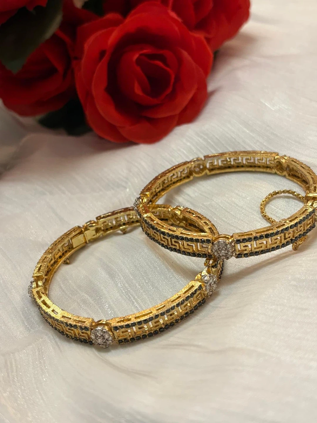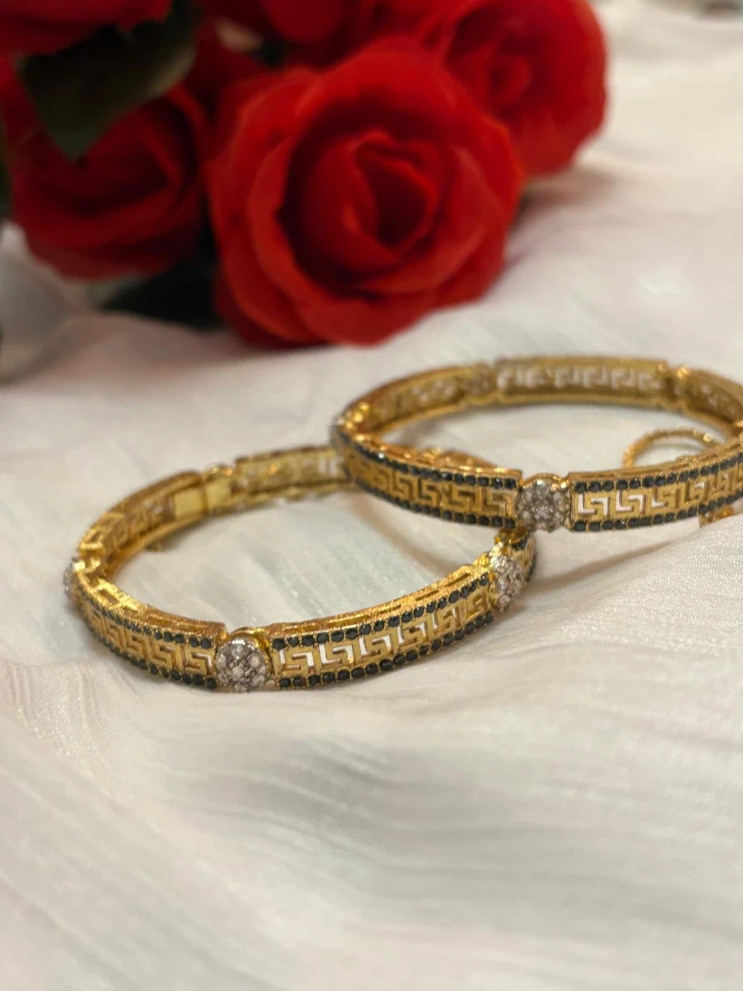 Selling a set of gold-tone bangle bracelets. They feature a Greek key design with black enamel accents and small clear stones. These would add a touch of elegance to any outfit!
