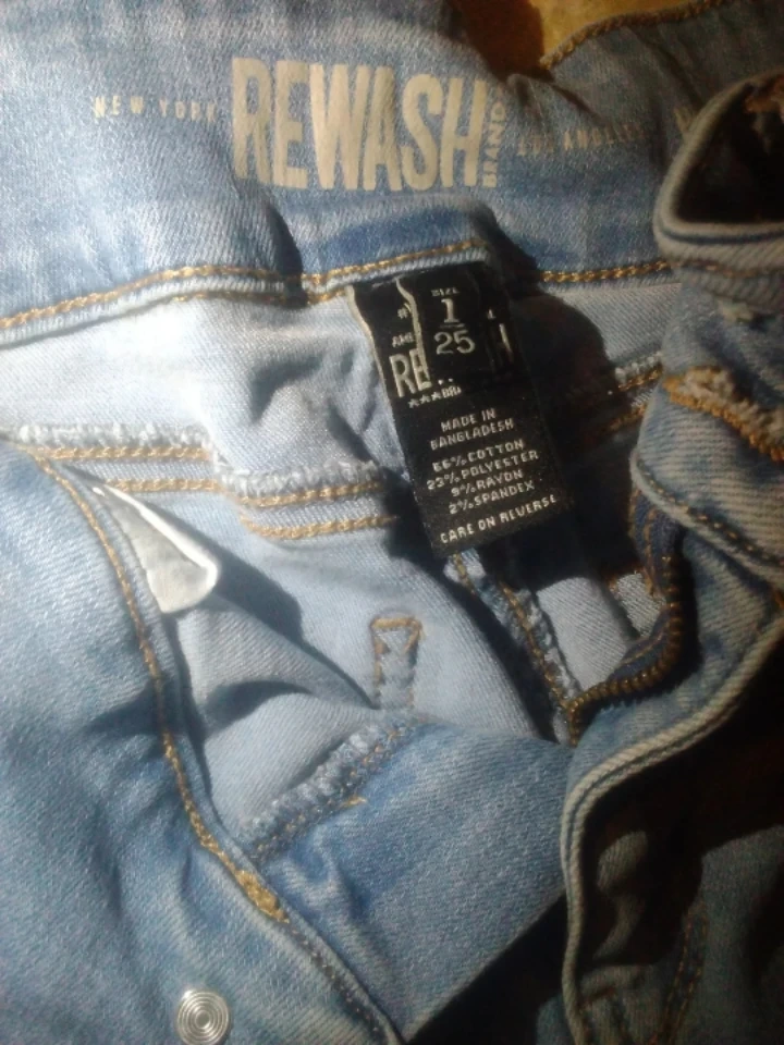 New York los Angeles These are light wash Rewash jeans. Made of 66% cotton, 23% polyester, 9% rayon, and 2% spandex. Great for everyday wear!