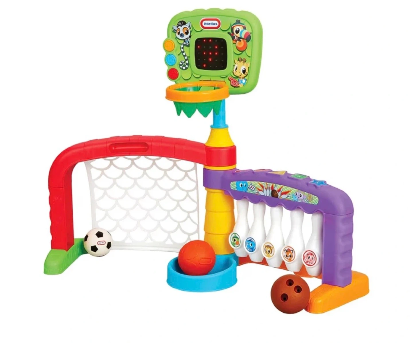 This Little Tikes 3-in-1 Sports Zone toy includes a basketball hoop, soccer goal, and bowling alley. It's designed for interactive play. Includes balls for each sport!