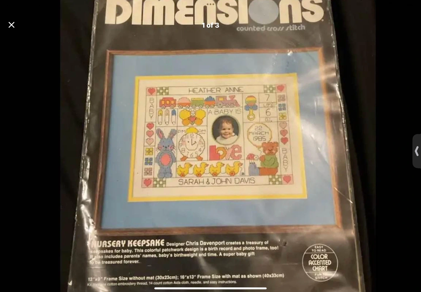 Vintage Dimensions counted cross stitch kit creates a nursery keepsake birth record and photo frame. It includes space for parents' names, baby's birthweight, and birth time. The kit comes with Aida cloth, embroidery thread, needle, and instructions.