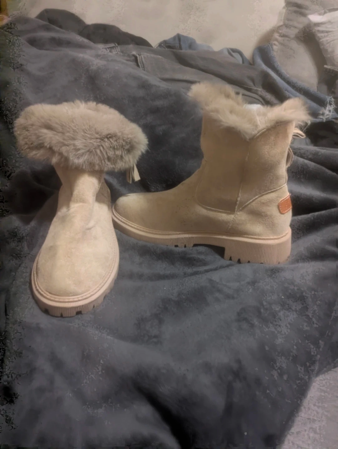 Cozy tan faux suede winter boots with a plush fur lining. They feature a convenient side zipper and a sturdy lug sole for traction. Boots are size 250 (EU 40).