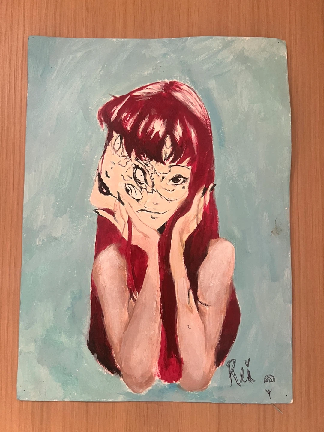 Acrylic painting on canvas featuring a stylized anime girl with two faces. The artwork is signed 'Rei' in the lower right corner. It has a vibrant, surreal aesthetic against a light blue background.