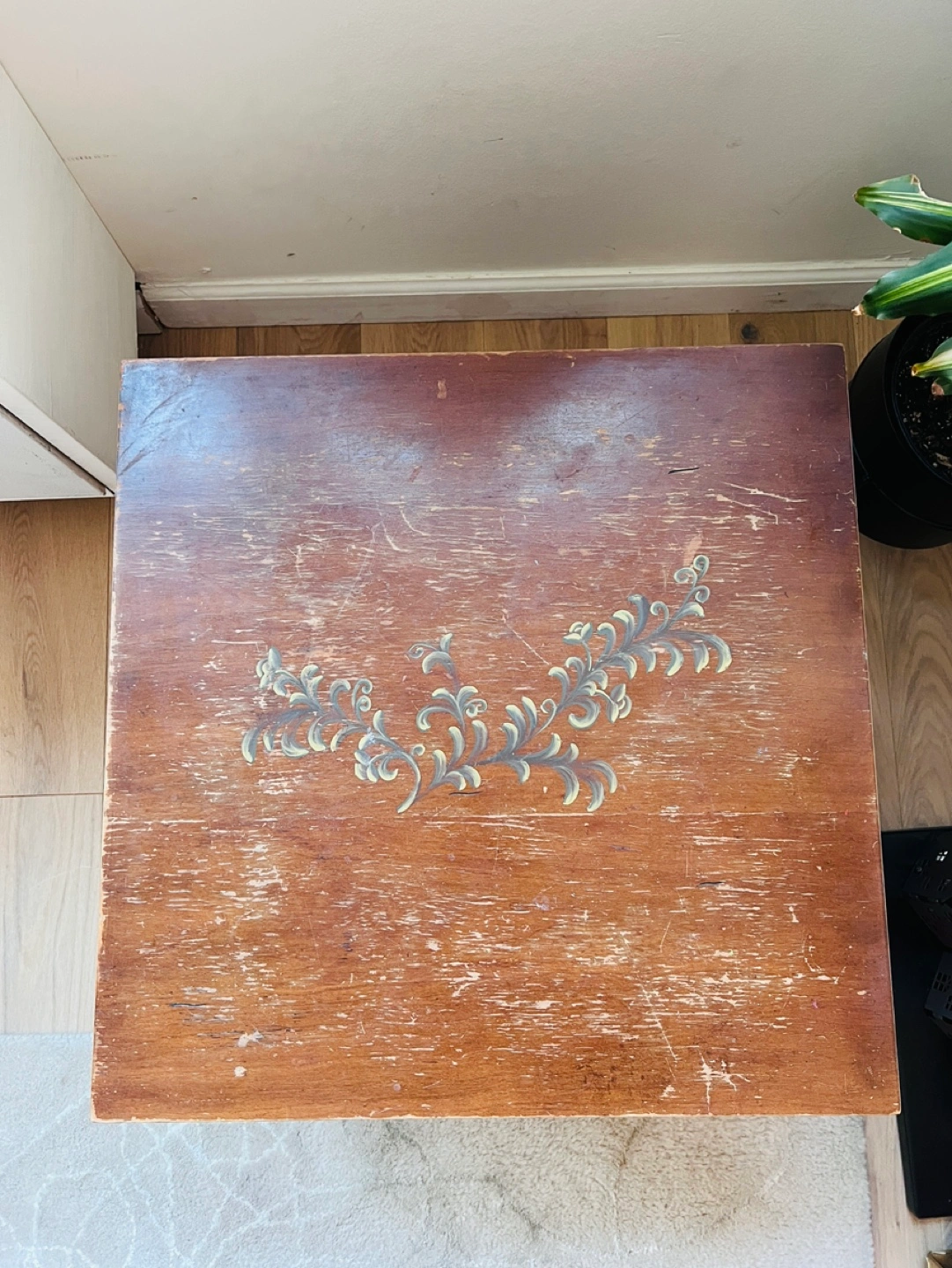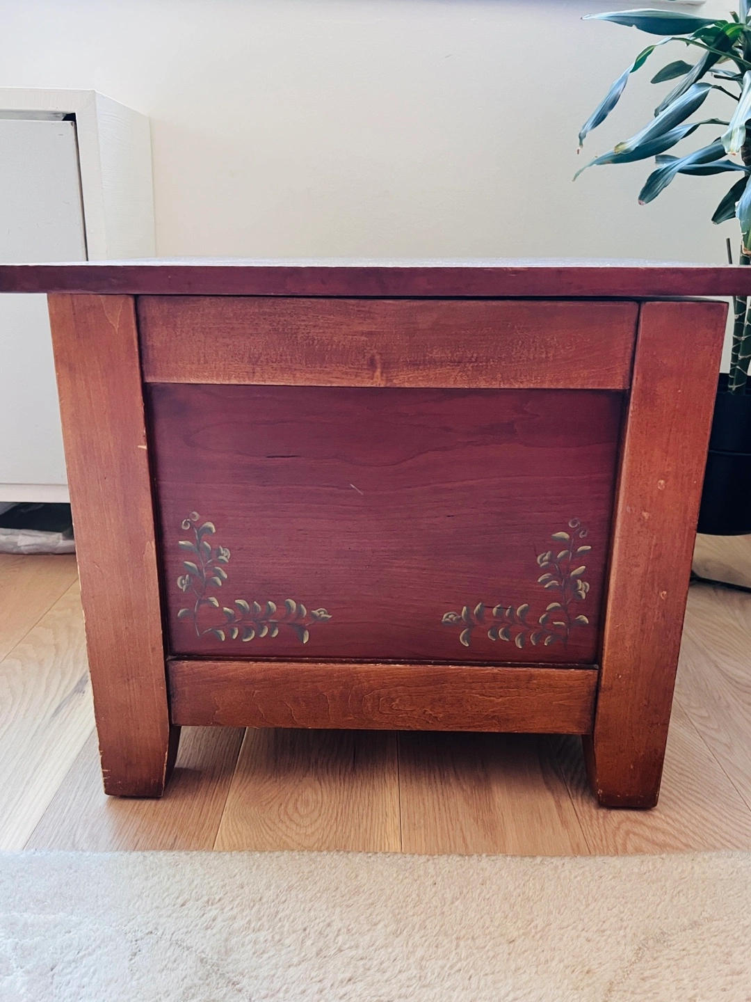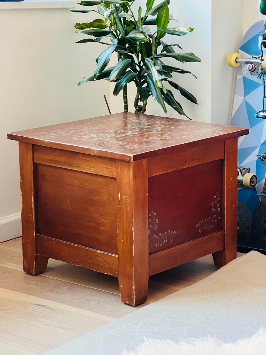 Wooden storage ottoman with a hinged lid. Features a floral design painted on all sides. Good condition but has some scratches which has great opportunity for diy.
