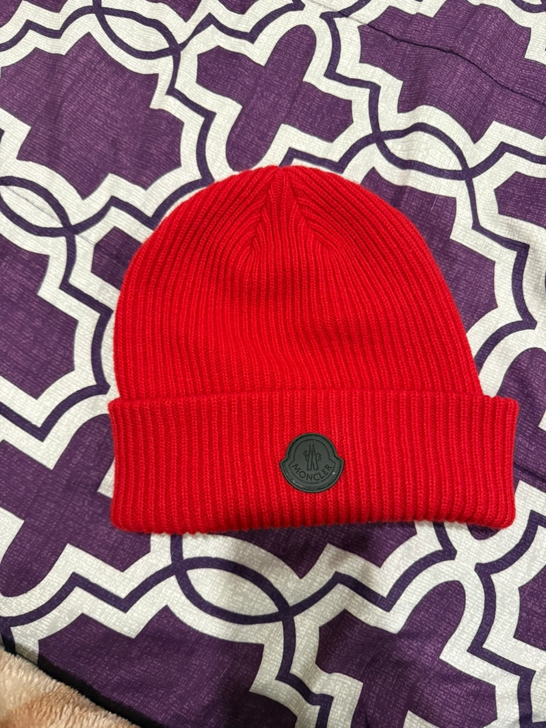 This is a red ribbed beanie from Moncler. It's made of a soft knit material. A classic accessory for colder weather!