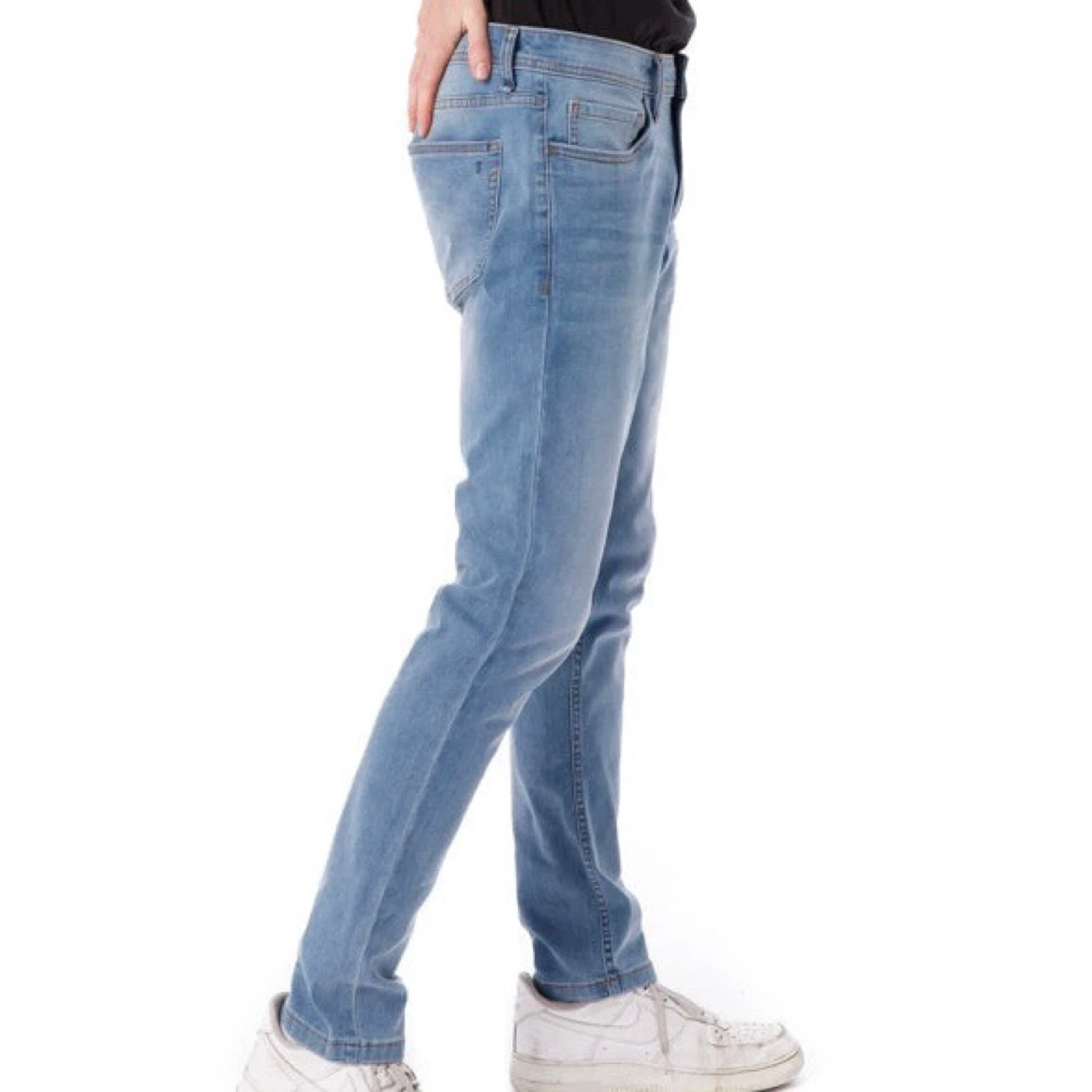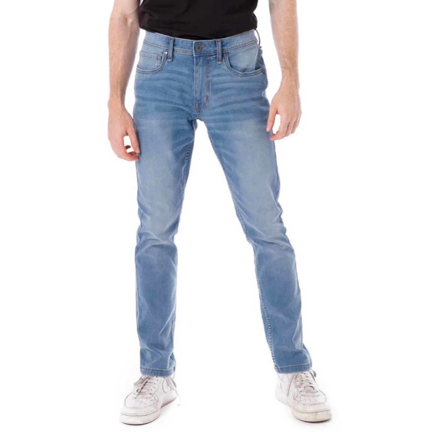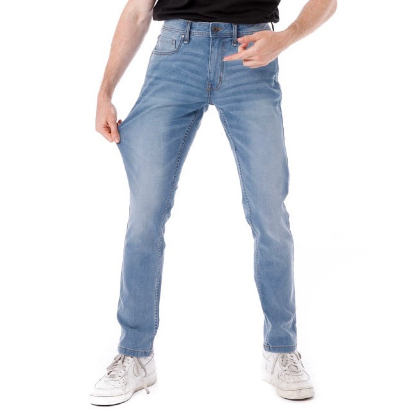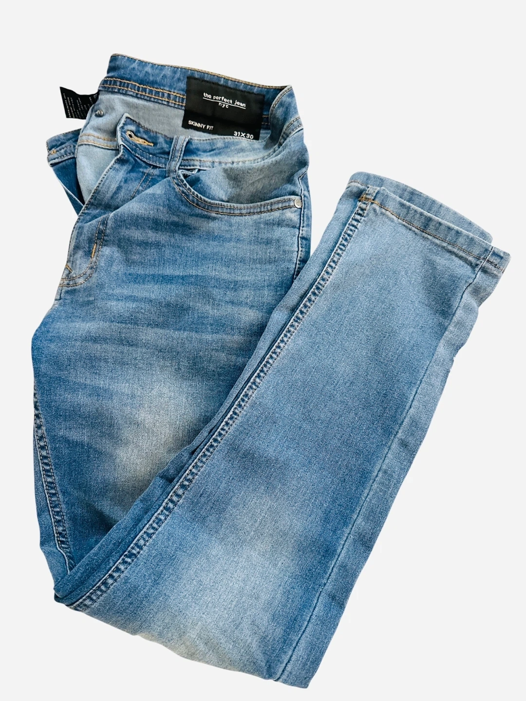 These are The Perfect Jean NYC skinny fit jeans in a light blue wash. They're a size 31x30. The material is a comfortable stretch denim.