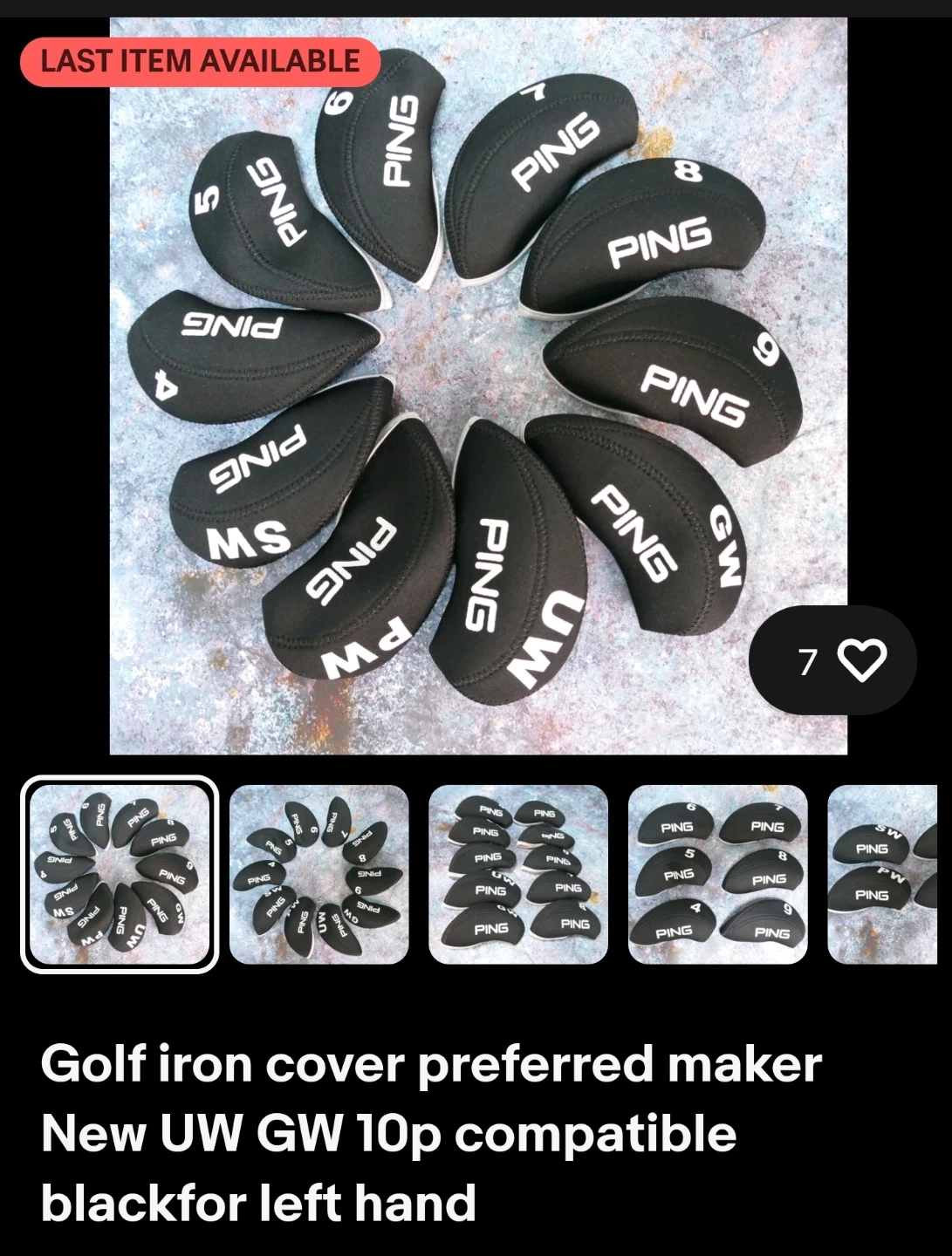 Set of 10 PING golf iron headcovers. Includes covers for UW, GW, SW, PW, and irons 4 through 9. Black color.