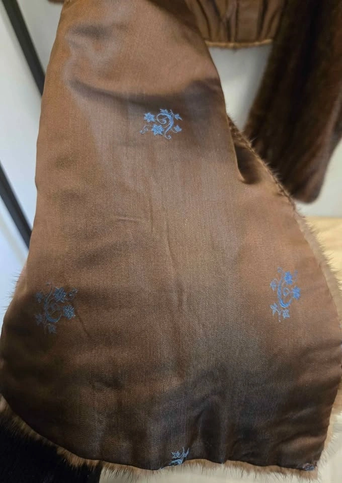 Rare, beautiful, vintage Schumacher genuine mink fur cape wrap in a rich chocolate brown tone. An elegant mid century silhouette with beautiful drape and natural sheen. The fur is dense and glossy, a true vintage furrier piece in excellent condition. Fully lined with original embroidered satin interior. No dryness, no cracking, no shedding. Approximate measurements: Back length 19 in, Front drape length 32 in, Shoulders 18 in. Size One Size fits most due to open wrap design. Well preserved estate piece.