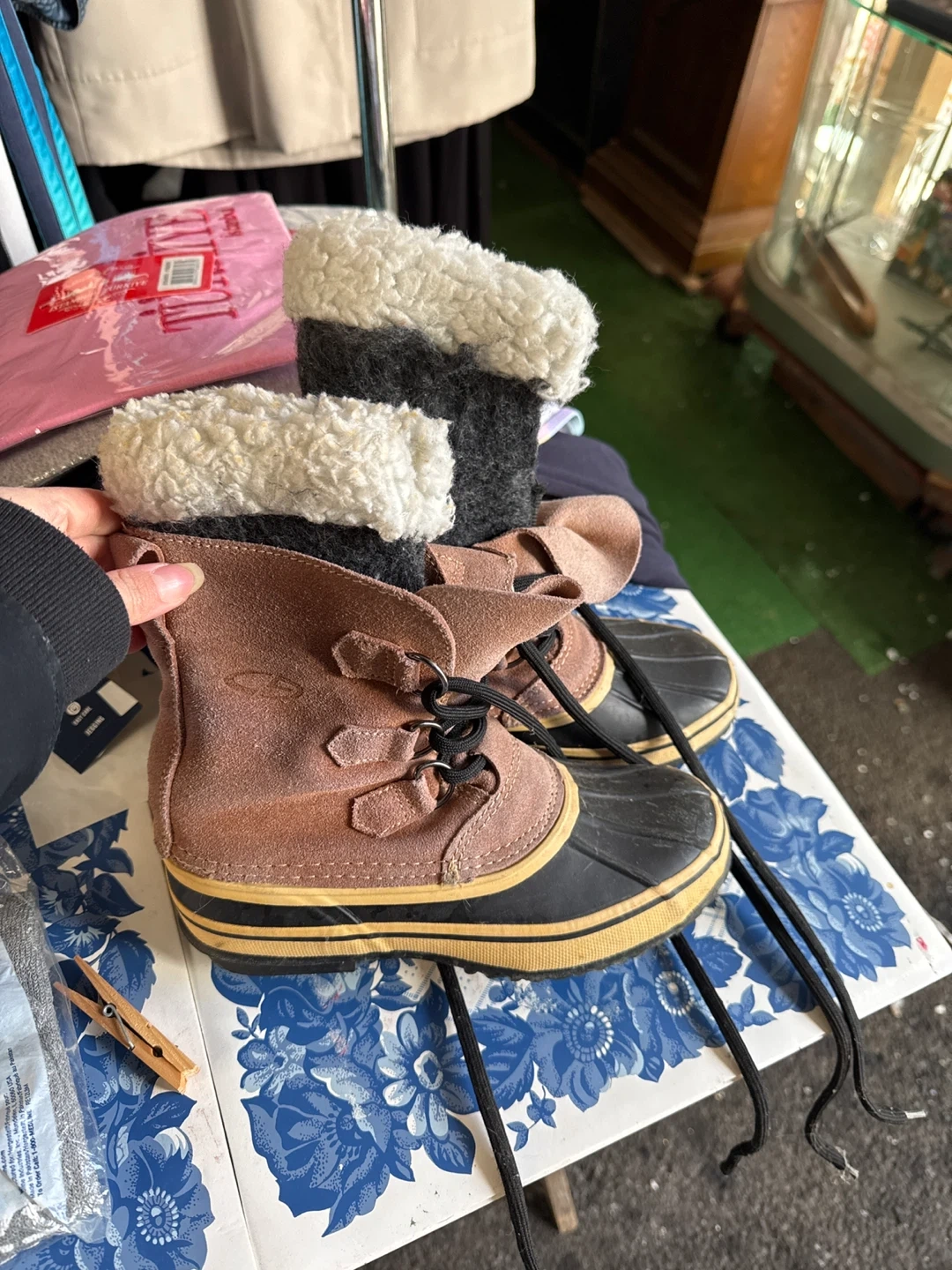 These brown and black winter boots feature a suede-like upper with a waterproof rubber base. They have a cozy faux fur lining and a lace-up front for a secure fit. Perfect for keeping your feet warm and dry in cold weather!